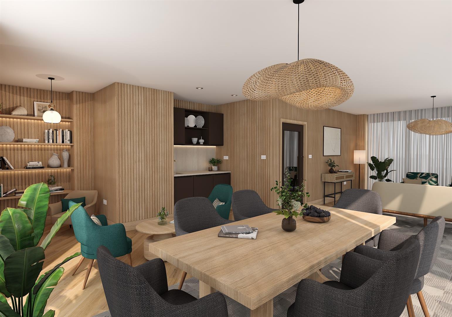 Open plan lounge, kitchen and diner offers a modern living space. The kitchen features a range of wall and base unit cabinetry and is equipped with fully integrated 'Bosch' appliance including a stainless steel oven, ceramic hob and extractor hood, integrated fridge freezer, dishwasher and stainless steel single bowl sink. LED under unit lighting. Hard flooring with underfloor heating throughout. LED downlights to kitchen with pendant lights to the well sized lounge and dining area. TV point.