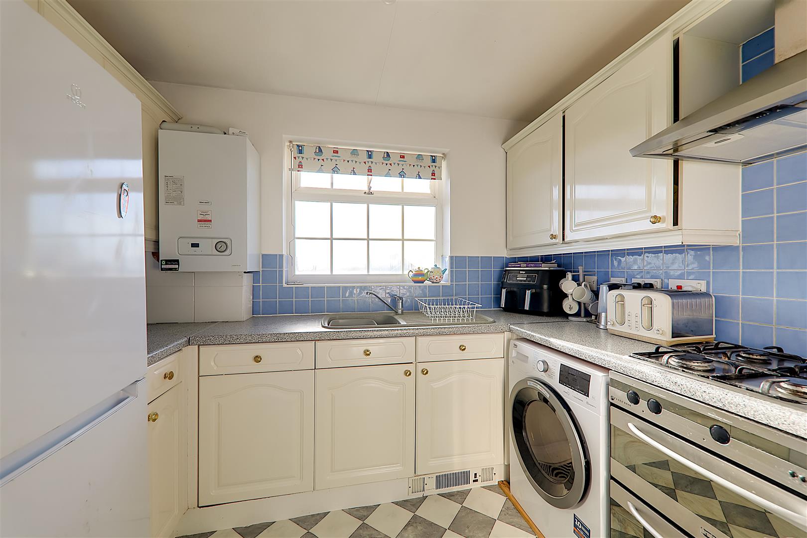 Vinyl floor, roll edge laminate work surfaces with cupboards below and matching eye level cupboards, integrated oven with four ring gas burning hob above and extractor fan over, space and provision for washing machine, space for fridge freezer, matching integrated dishwasher, inset single drainer sink unit with mixer tap, PVCU double glazed window, skimmed ceiling.
