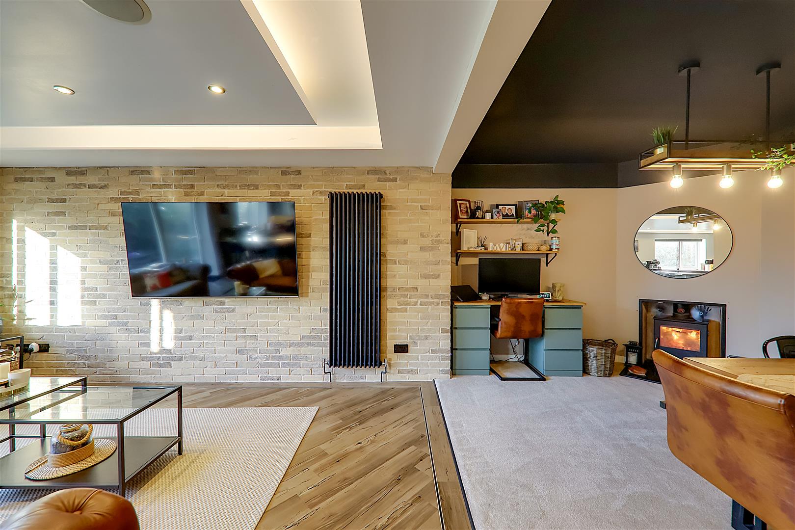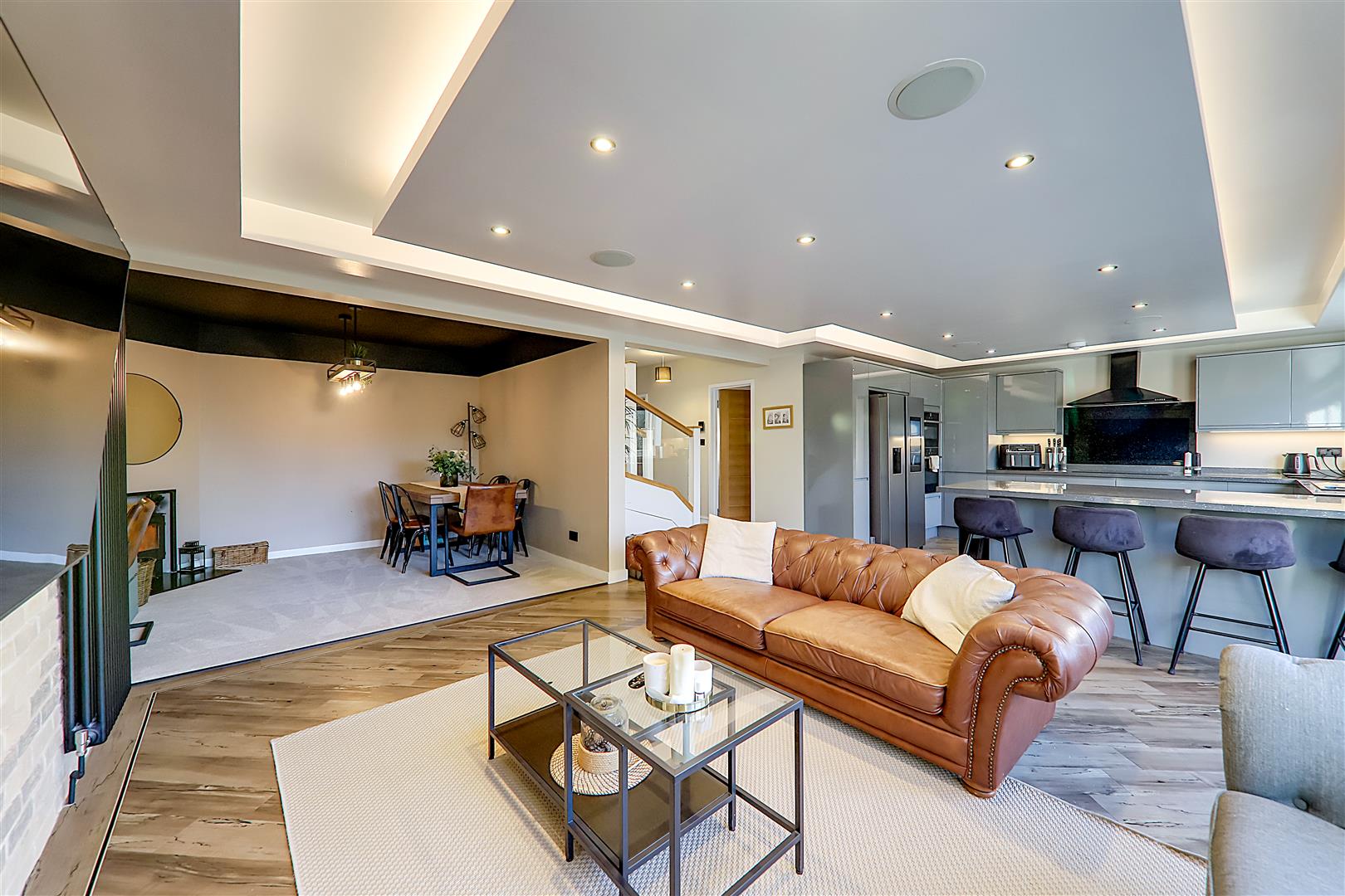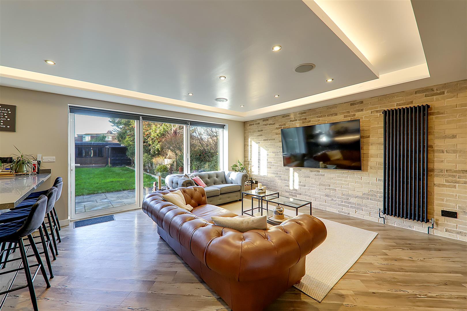 Karndean wood effect flooring, upstanding school radiator, television point, various power points, feature exposed brick wall, bi-folding doors leading out onto rear garden, recessed ceiling with LED lighting, built in speakers & spotlights.
