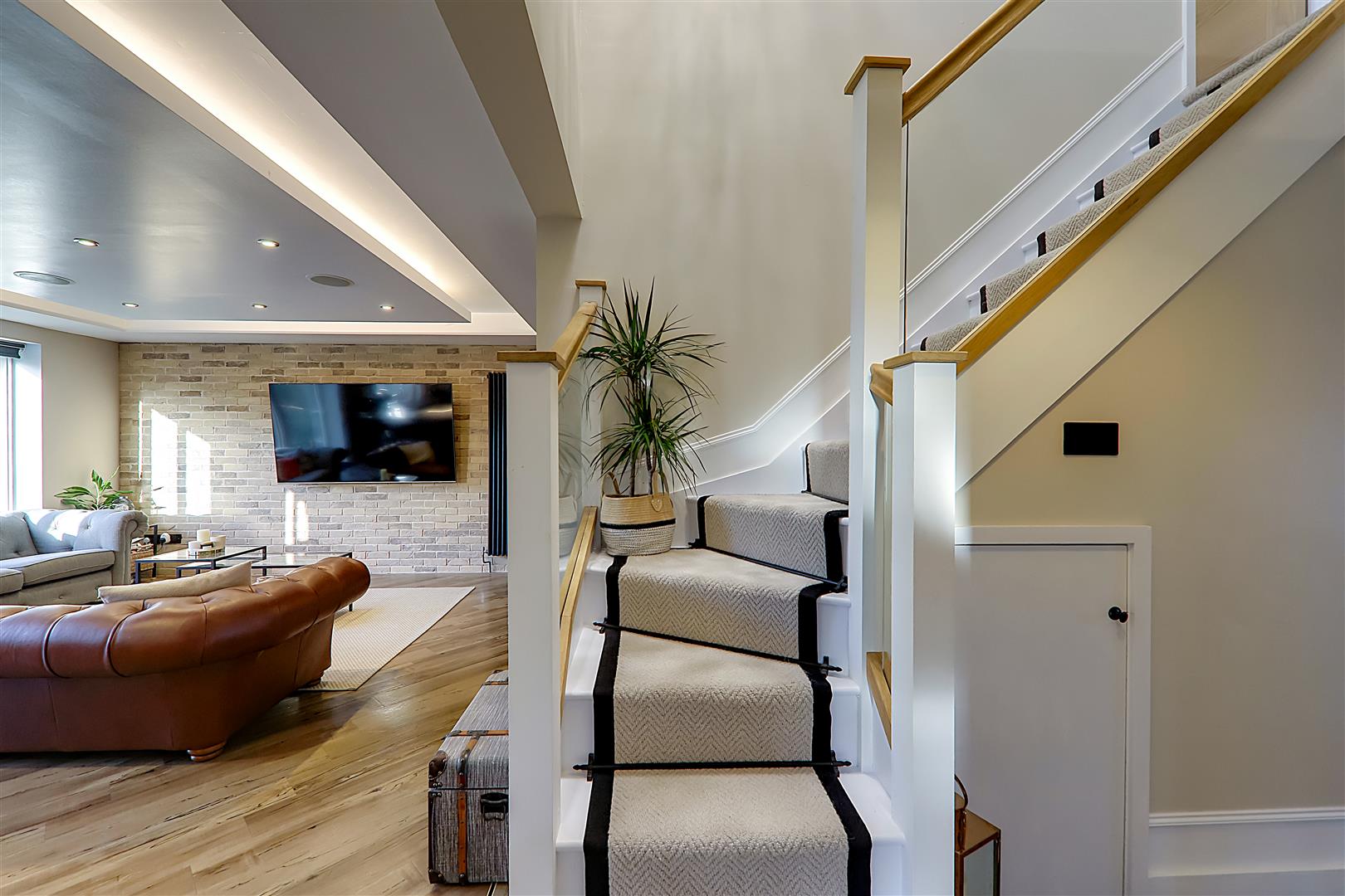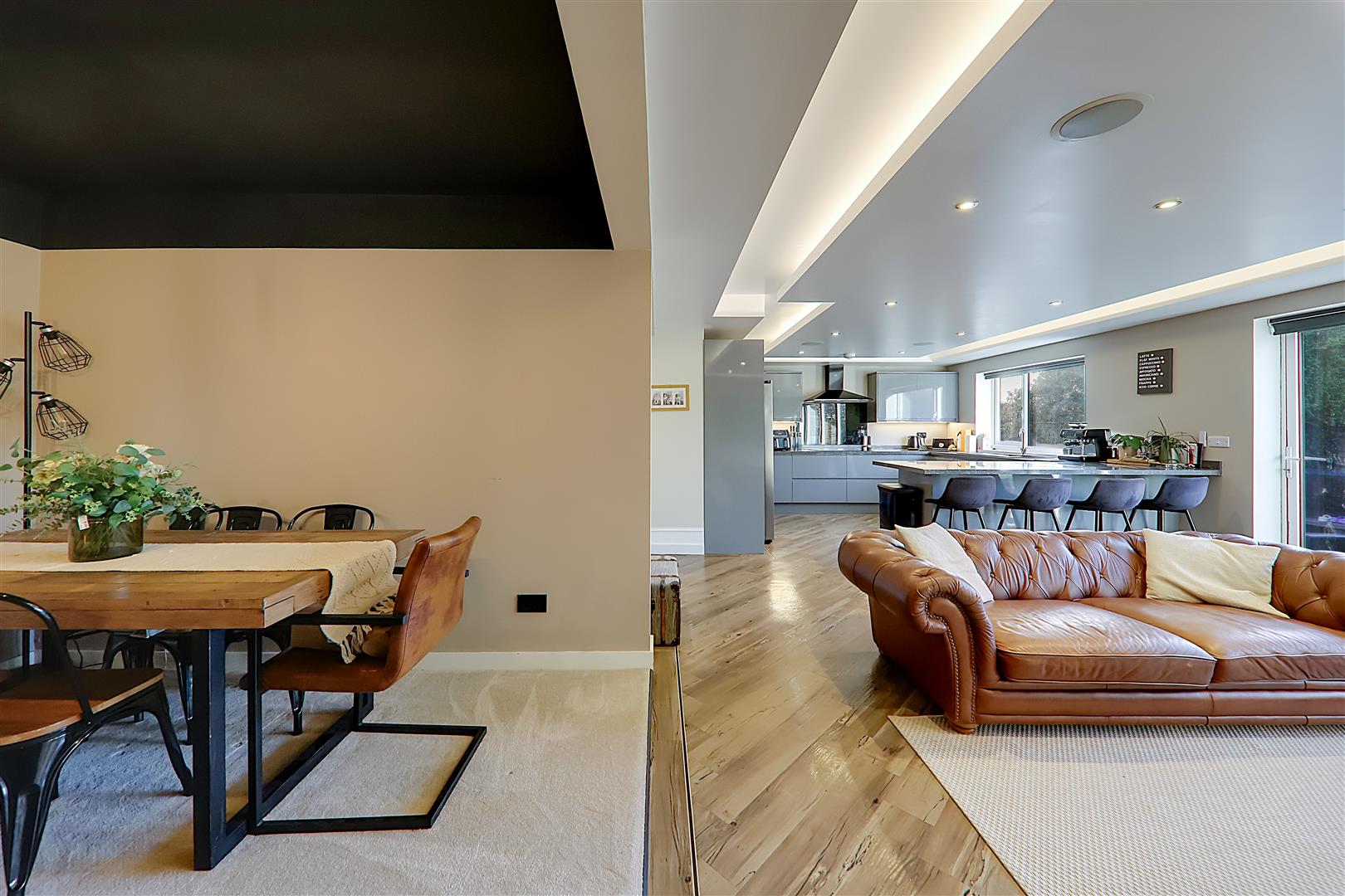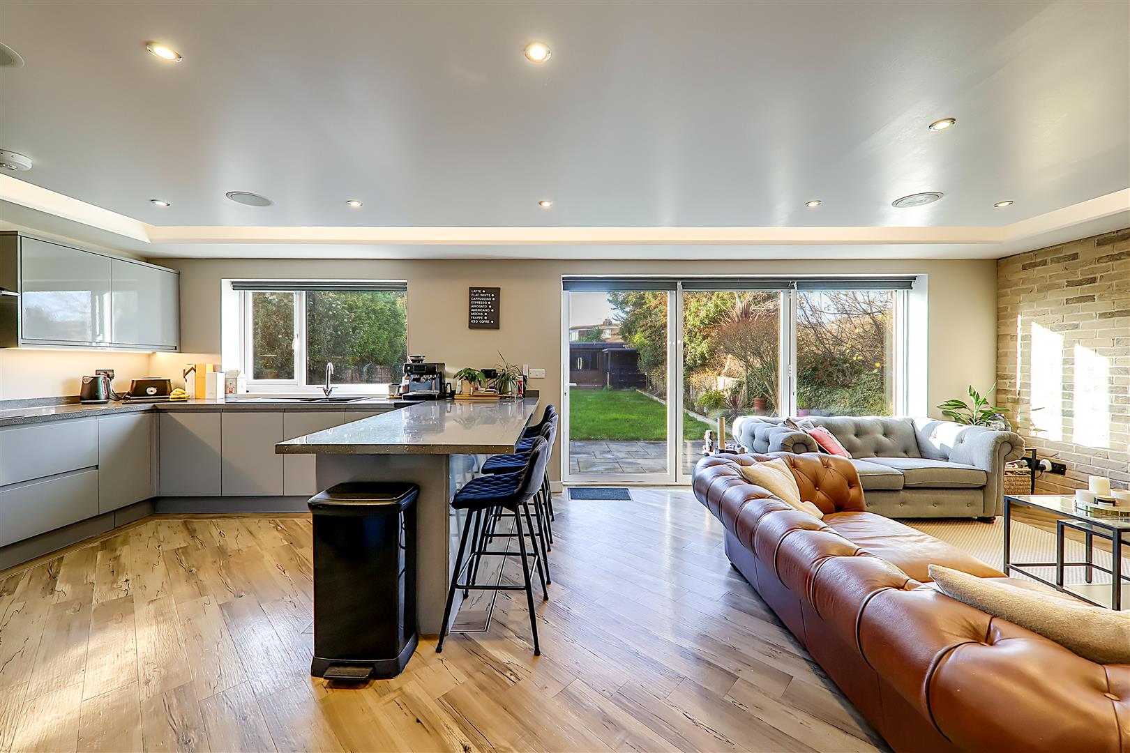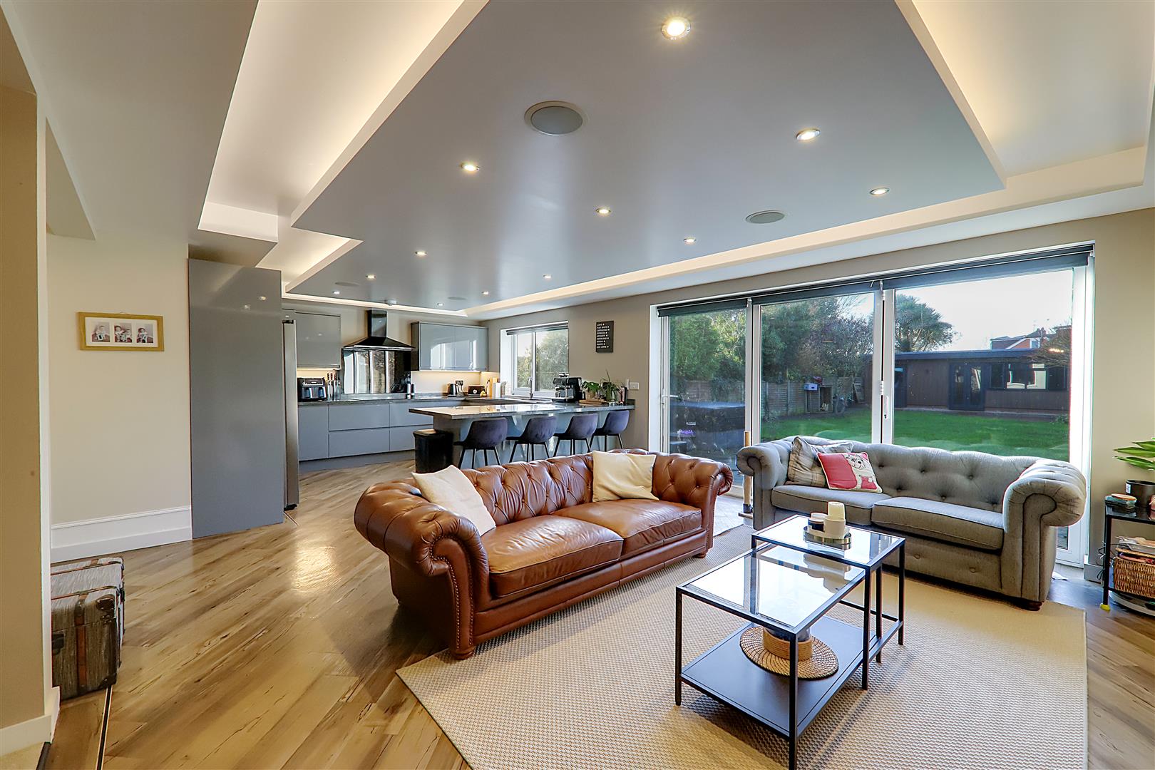 Karndean wood effect flooring, upstanding school radiator, television point, various power points, feature exposed brick wall, bi-folding doors leading out onto rear garden, recessed ceiling with LED lighting, built in speakers & spotlights.