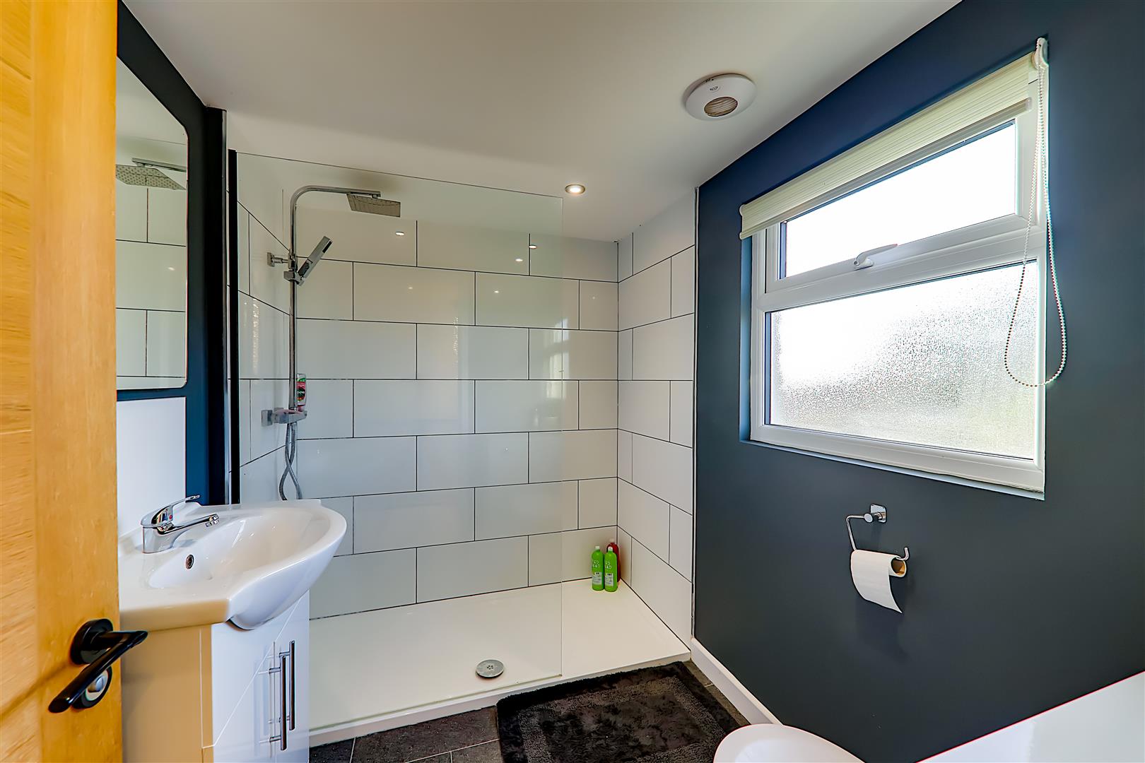 Tile effect vinyl flooring, low flush WC, double width shower cubicle having an integrated power shower with rainforest fall shower head, contemporary hand wash basin with vanity unit below & mixer tap, wall mounted de-misting mirror, chrome ladder style heated towel rail, extractor fan, skimmed ceiling with spotlights, PVCU double glazed obscured glass window.