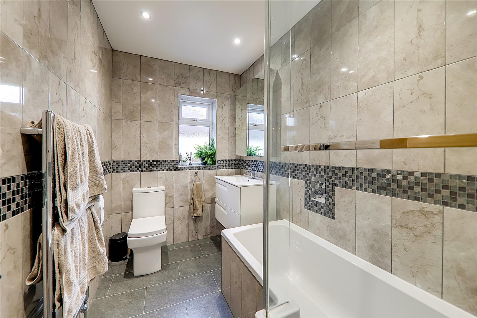 Tile effect flooring, panel enclosed bath with power shower above having a rainforest fall shower head, fully tiled walls, low flush WC, contemporary hand wash basin with draws below & mixer tap, wall mounted vanity unit with mirrored front, chrome ladder style heated towel rail, PVCU double glazed obscured glass window, skimmed ceiling with spotlights.