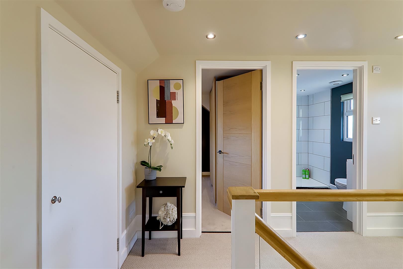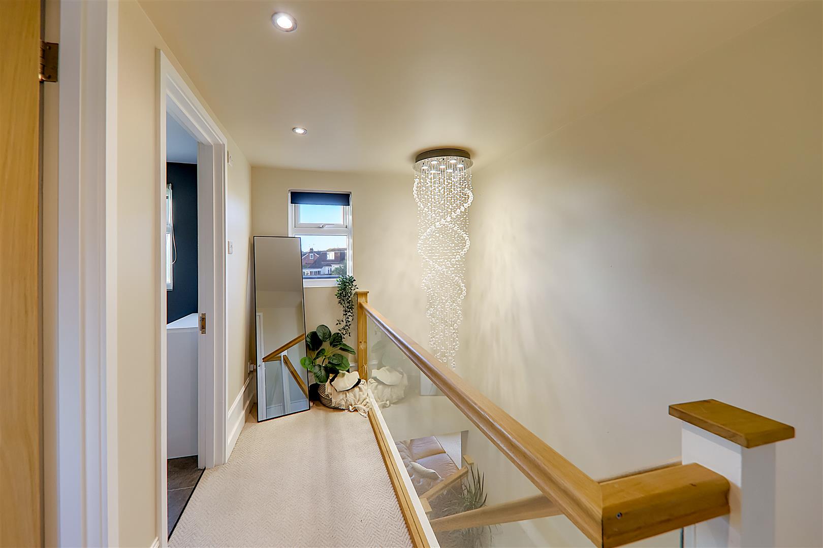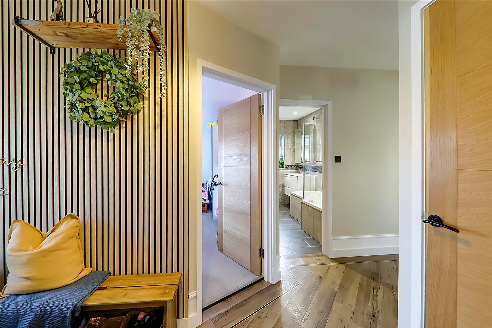 Composite front door, karndean wood effect flooring, school radiator, feature wooden panelled wall, access to understairs storage cupboard, skimmed ceiling, smoke detector, wall mounted smart heating control panel with mobile phone activation available, stairs leading to first floor landing with glass balustrade.