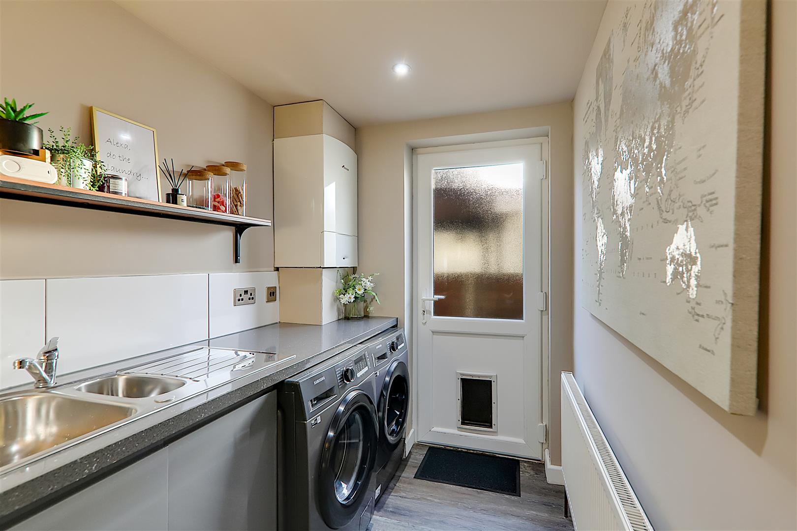 Karndean wood effect flooring, square edge worktop with cupboards below, space & provision for washing machine & tumble dryer, inset stainless steel one & a half bowl single drainer sink unit with mixer tap, tiled splashback, various power points, wall mounted Worcester combination boiler, PVCU double glazed door leading to side access, single radiator, skimmed ceiling with spotlights.