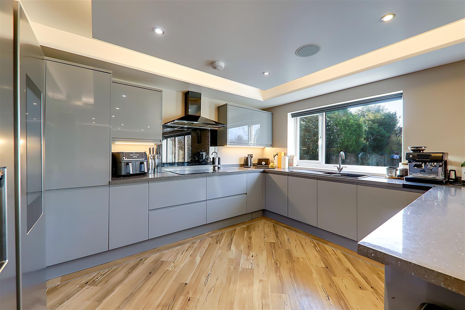 Karndean wood effect flooring, square edge laminate work surfaces with cupboards below & matching eye level cupboards, breakfast bar area with seating for four, space for American style fridge freezer, integrated eye level Neff pyrolytic double oven, five ring Lamona induction hob with extractor fan above, matching integrated uncounter fridge unit, matching integrated dishwasher, Inset Franke one & a half bowl sink unit with single drainer & mixer tap, various power points, PVCU double glazed window, recessed ceiling with LED lighting, built in speaker system & spotlights.