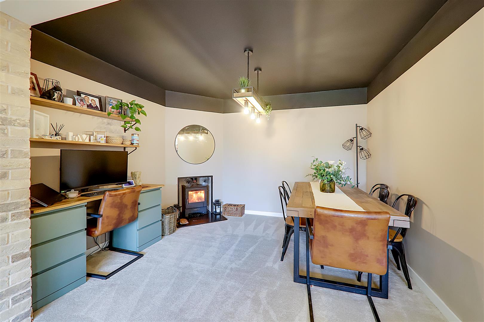 Carpeted floor, various power points, feature log burner, skimmed ceiling, hanging light pendant.