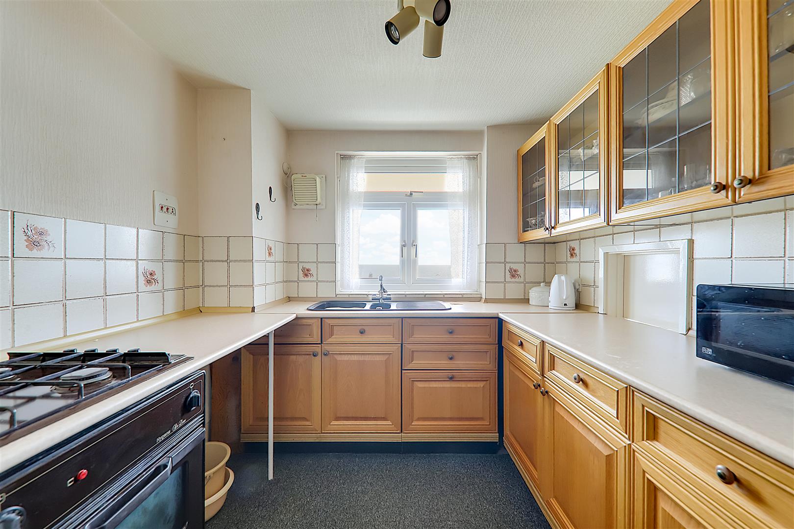 Roll edge work surface having inset 1 1/2 composite sink with mixer tap and draining board. Four ring gas hob with fitted oven below. Space for fridge/freezer. Matching range of cupboards, drawers and eye level wall units. Larder cupboard with shelving and housing hot water tank. Double glazed window with direct sea views.