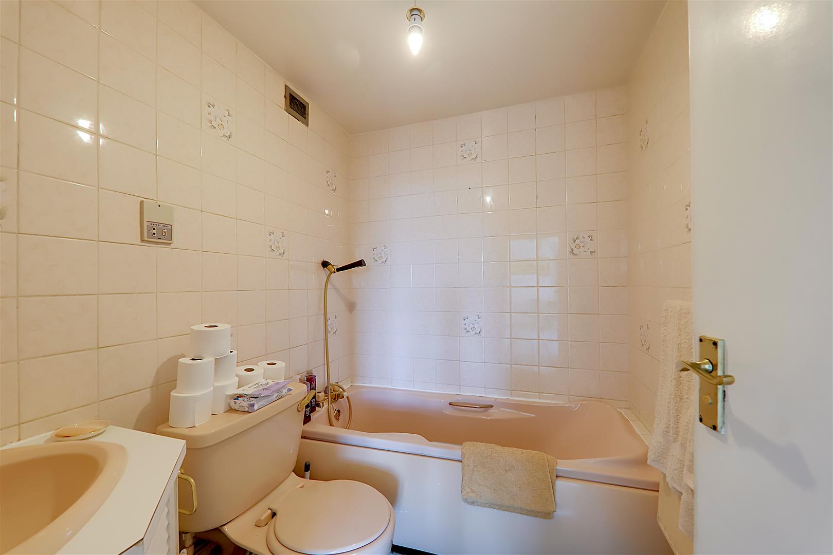 Tiled walls. Paneled bath with mixer tap and separate handheld attachment. Vanity unit with wash hand basin and cupboard below. Close coupled wc. Shaving socket.