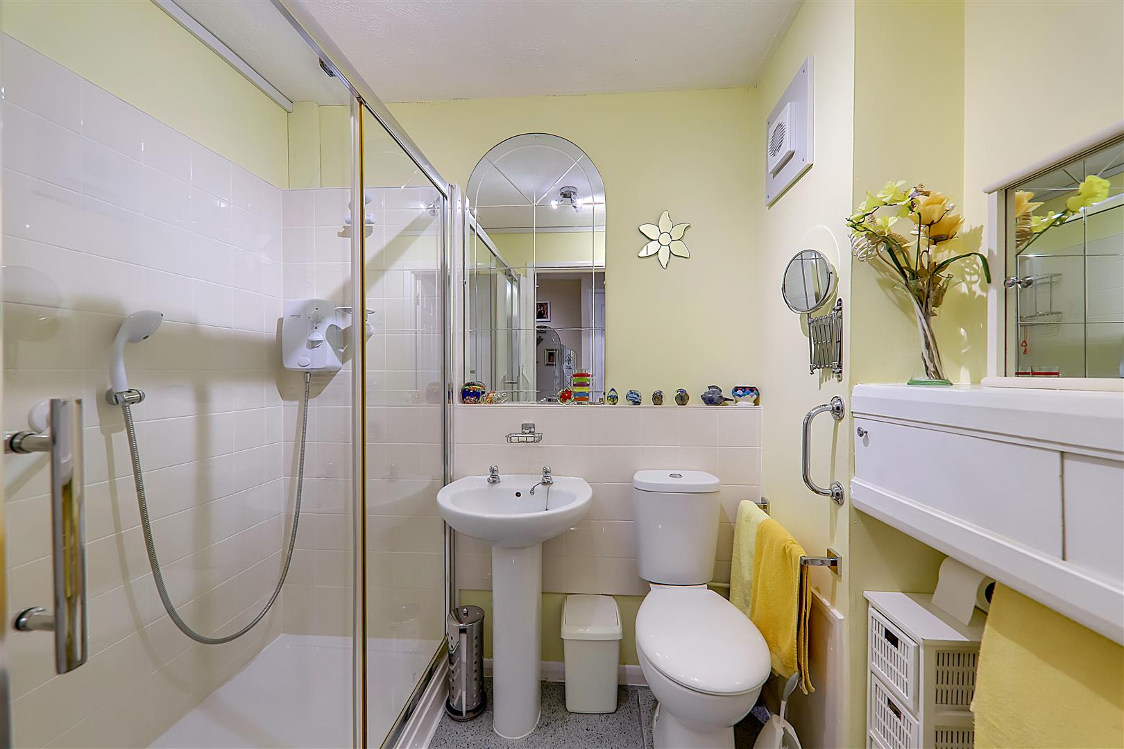Vinyl floor, fitted double width shower cubicle having an integrated electric shower & fitted seat, pedestal hand wash basin with hot & cold tap, low flush WC, wall mounted electric heater, extractor fan, textured ceiling.