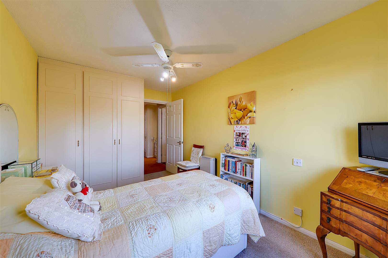 Carpeted floor, night storage heater, fitted storage cupboard with hanging rail, second fitted storage cupboard housing hot water cylinder, wall mounted electric fuseboard, smoke detector, textured ceiling, loft hatch access.