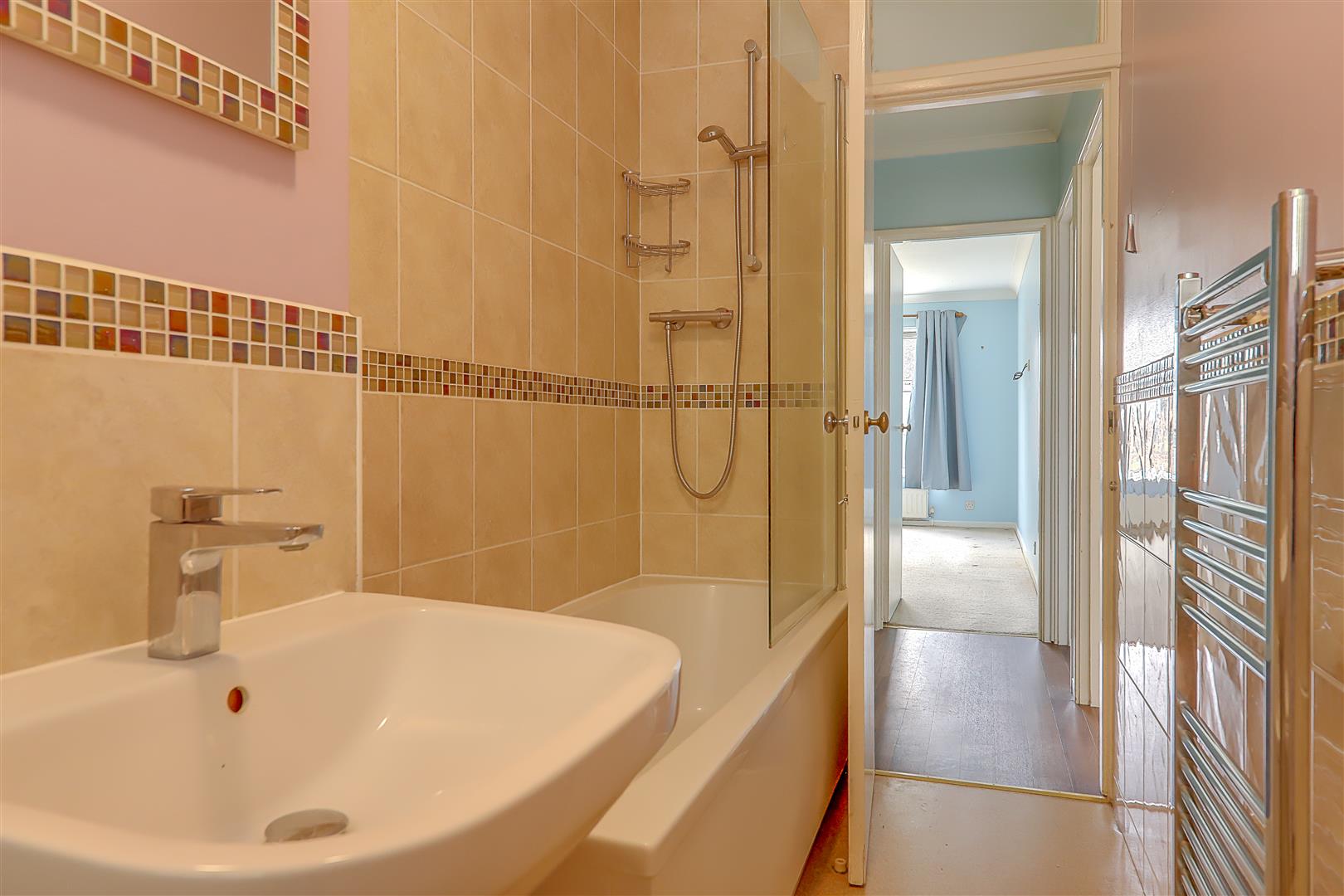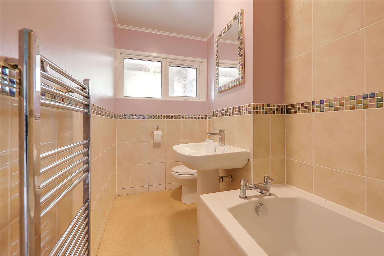 Half tiled walls. Low level Wc. Matching wash hand basin. Panelled bath with shower attachment above. Frosted double glazed window. Wall mounted heated towel rail.