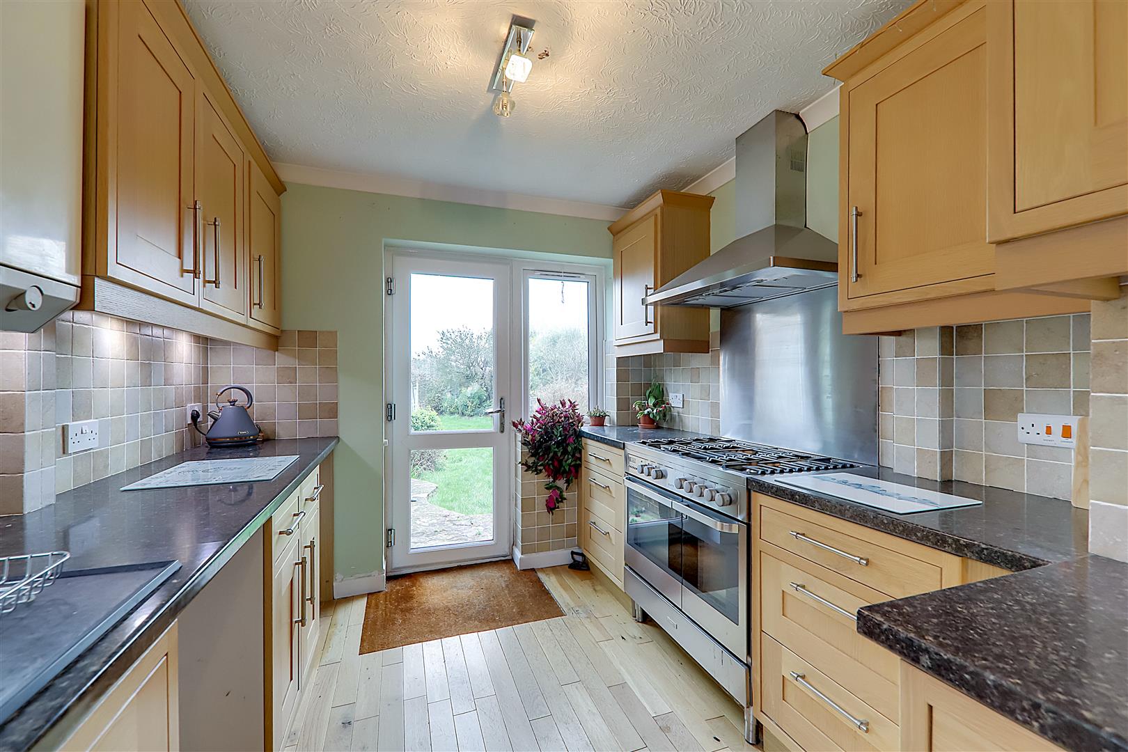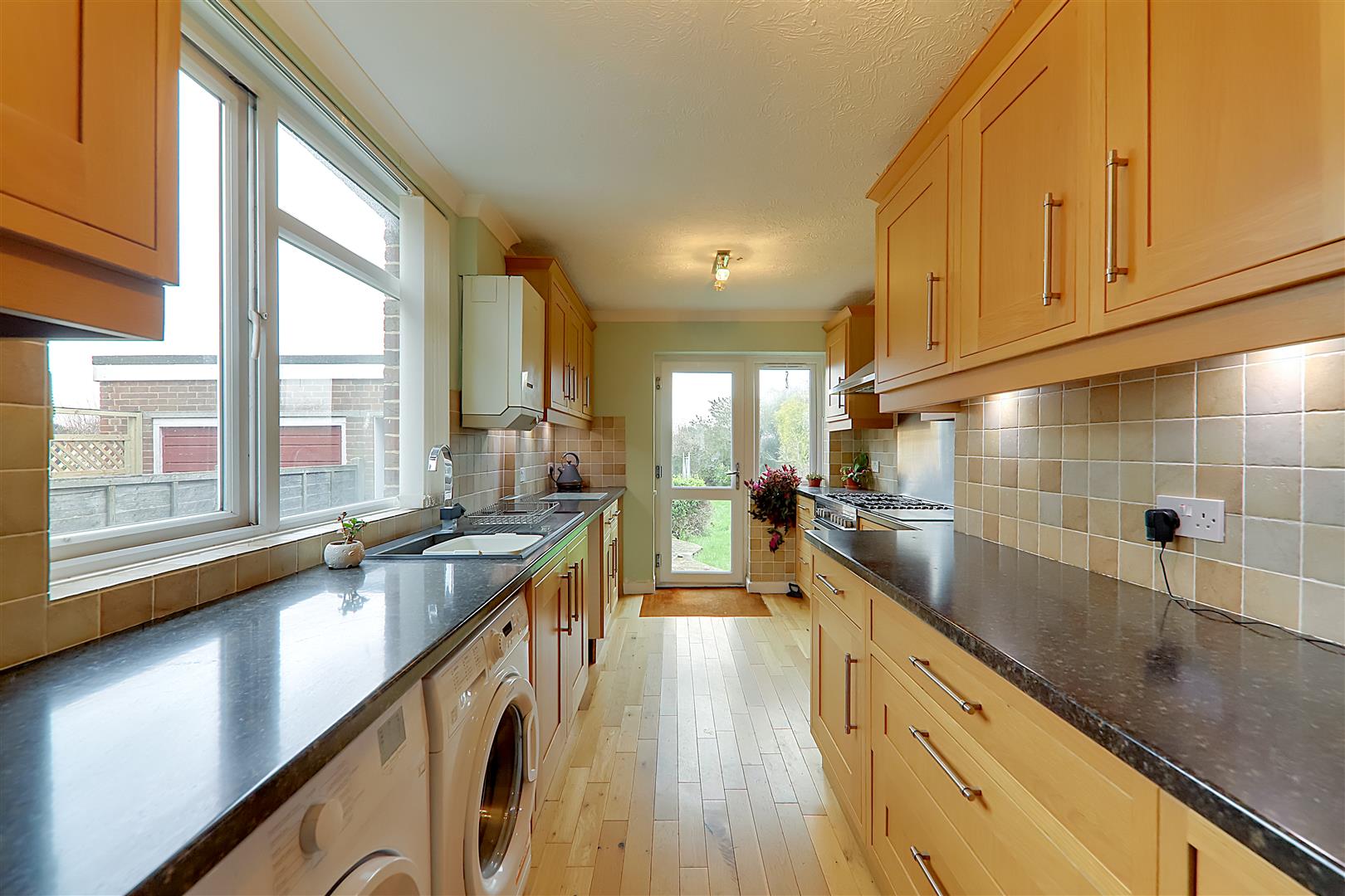 Fitted suite comprising of a single drainer sink unit with mixer taps and having storage cupboard and appliance space below. Areas of rolltop work surfaces offering additional cupboards and drawers under. Matching shelved wall units. Space for range cooker with extractor hood over. Space for washing machine, tumble dryer and further appliances. Radiator. Part tiled walls. Wall mounted Potterton central heating boiler. Wood flooring. Coved and textured ceiling. East and South aspect double glazed windows. Double glazed door to rear garden.