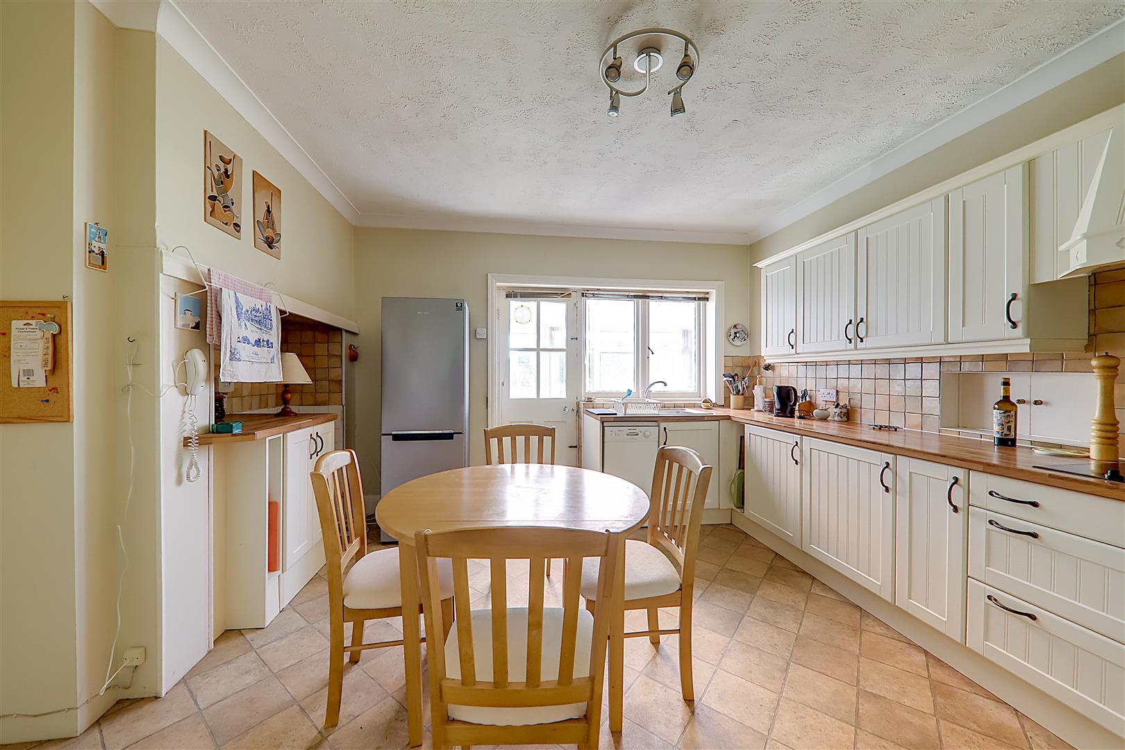 Range of work surfaces with cupboards and drawers fitted under. Inset single drainer sink unit. Fitted electric hob with extractor canopy above. Built-in high-level oven and grill. Space for slimline dishwasher and fridge freezer. Matching wall cupboards one with glass display door. Serving hatch. Part tiled walls. Walk-in larder cupboard with window and shelves. Wall mounted electric heater. Door to garage. Glazed door and window windows overlooking and leading to south facing sun lounge. Opening to utility room.