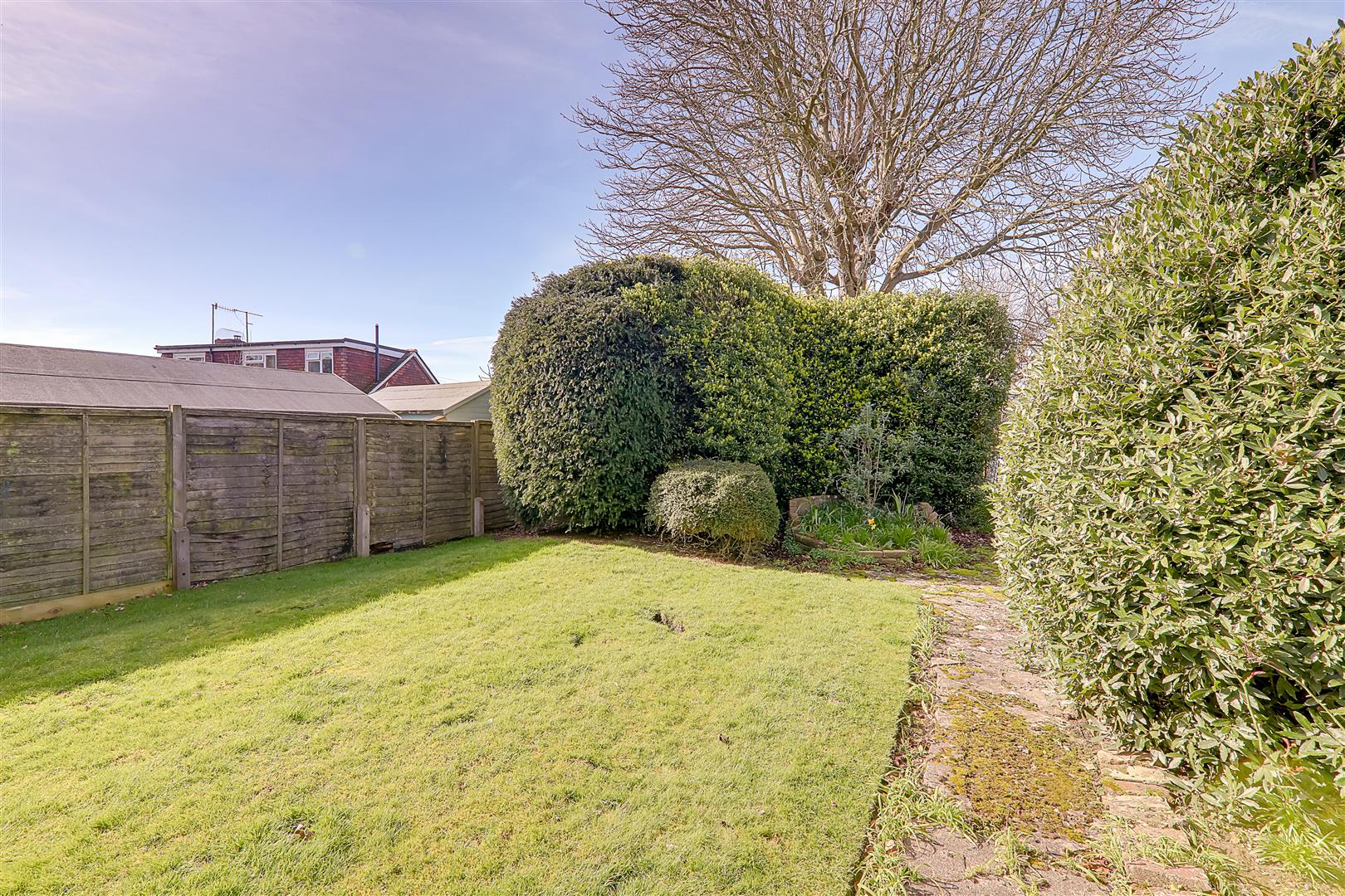 Shaped maintained lawns with seasonal planted borders. Paved pathway leading to additional gate providing access to the rear garden.