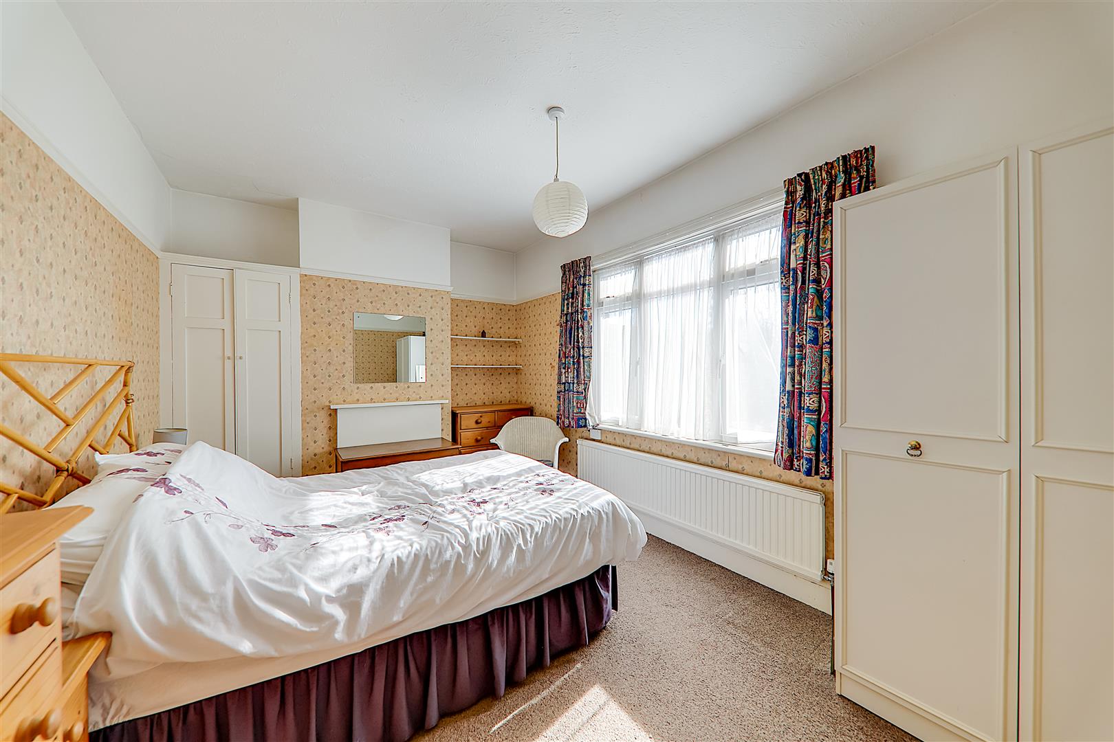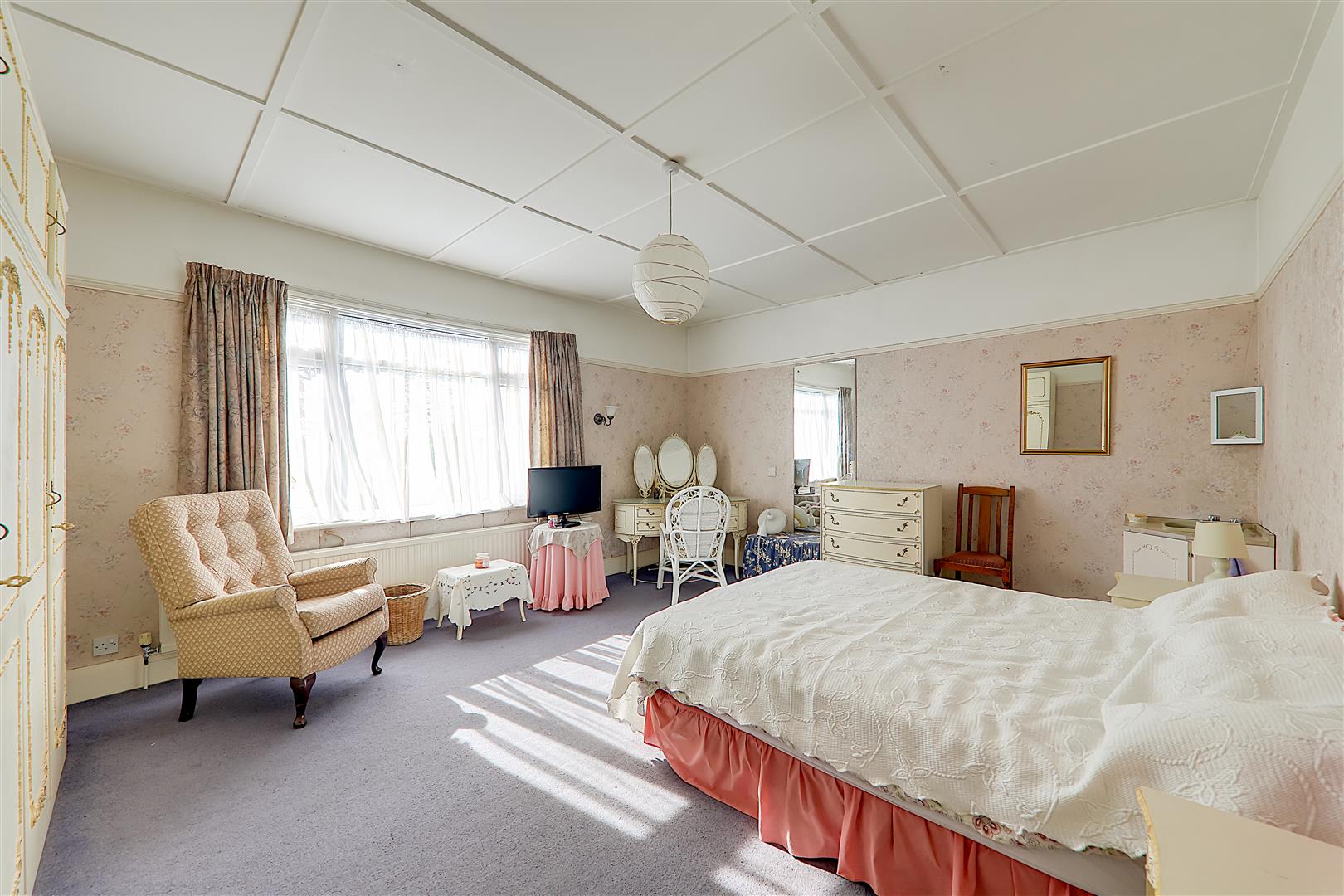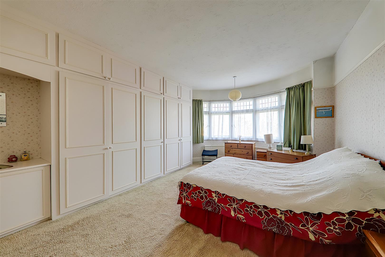 Feature bay window to front. Radiator. Picture rail. Range of built-in wardrobes with vanity surface and inset sink and cupboards above.