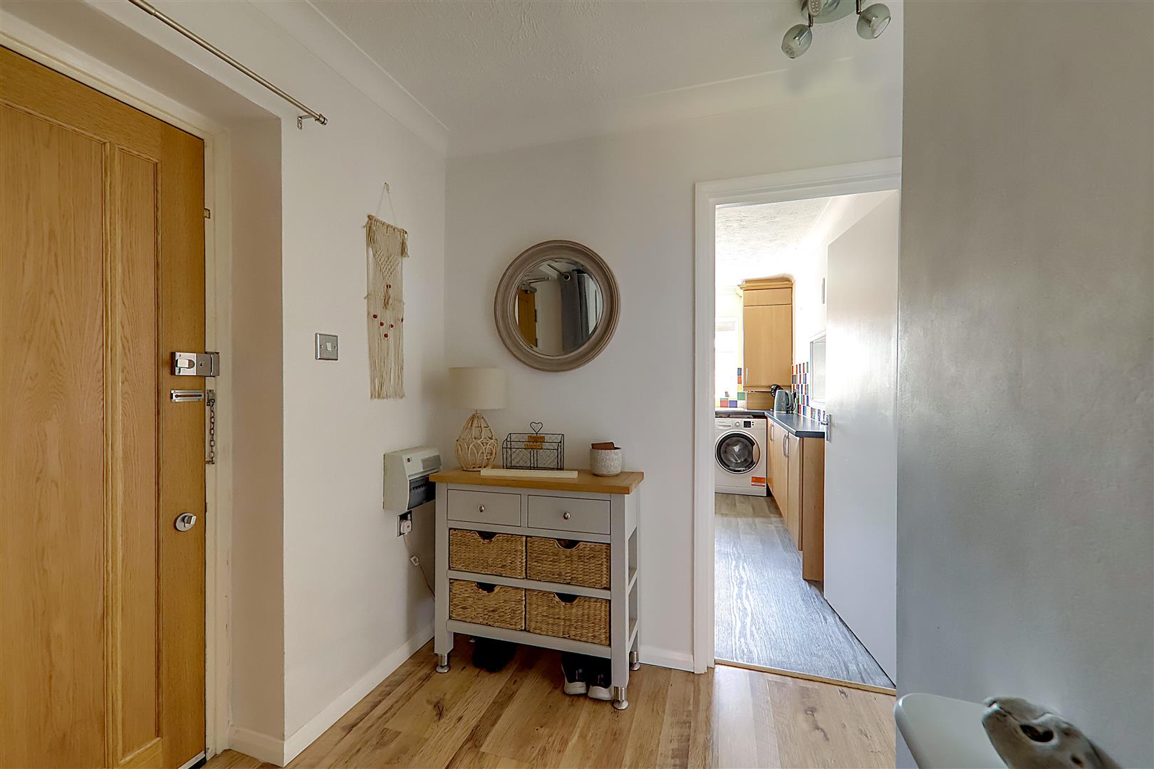 Radiator with display shelf over. Central heating thermostat. Fitted storage cupboard. Wood effect vinyl flooring. Entryphone. Coved and textured ceiling.