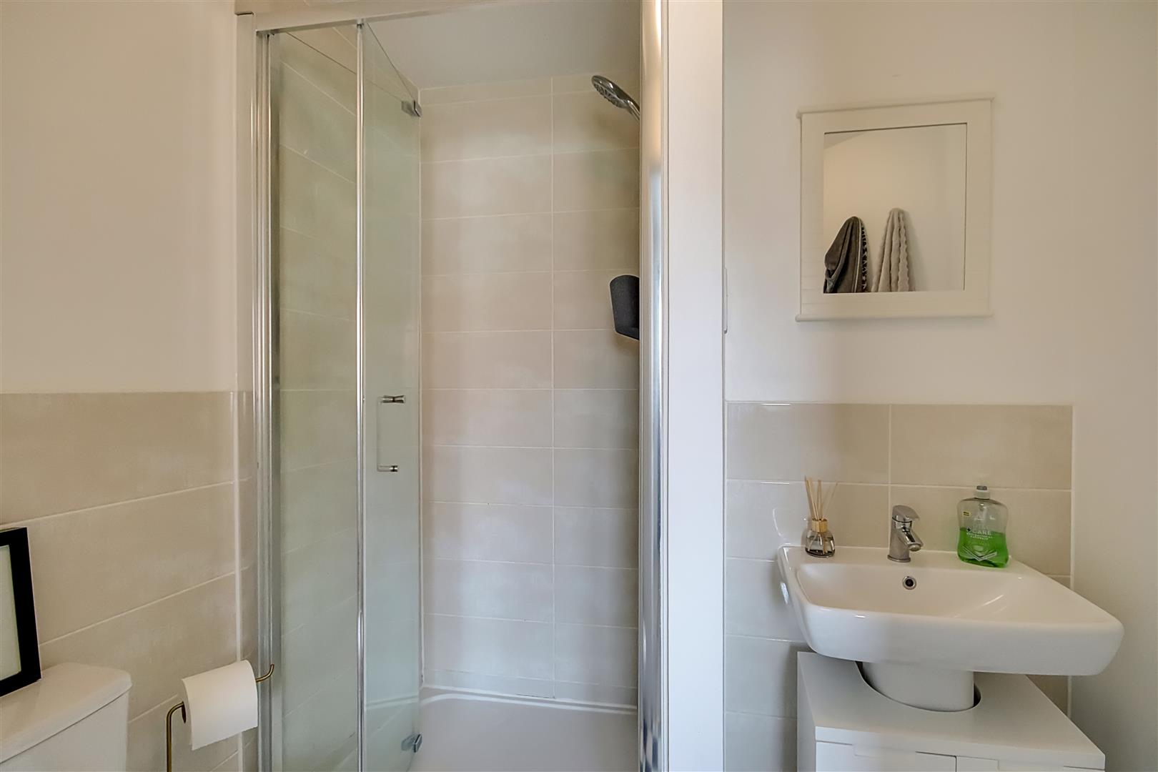 Close coupled WC. Step in shower cubicle with folding glass door, wall mounted controls with shower on riser rail. Wash hand basin with with stainless steel mixer tap. Radiator. Checkerboard vinyl flooring. Dome light. Extraction fan.
