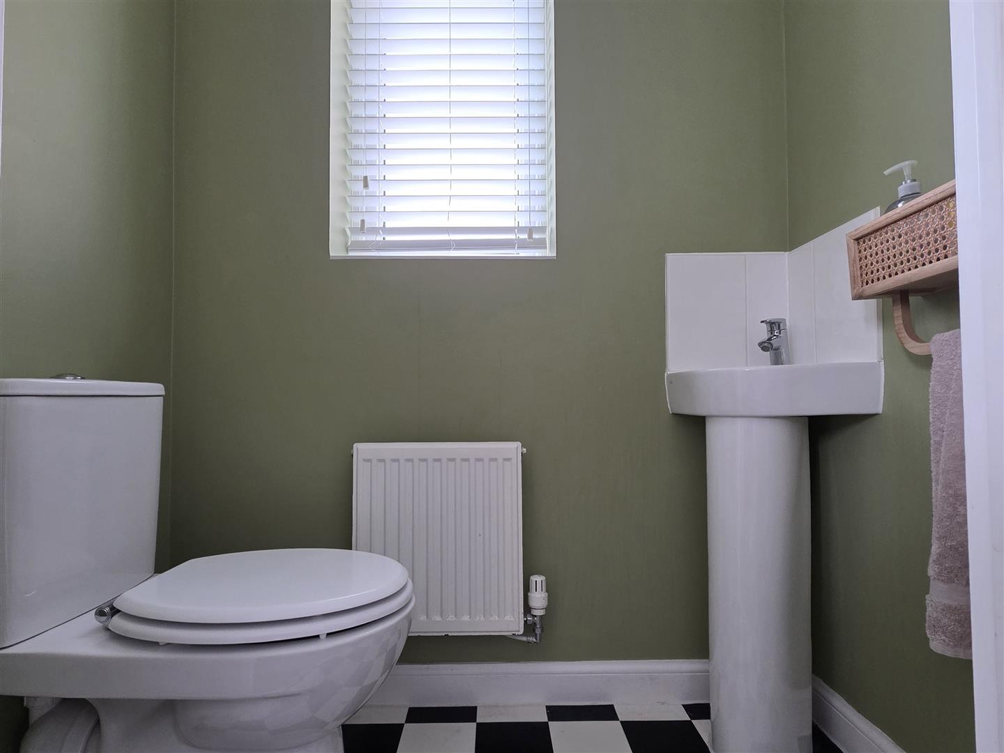 Wash hand basin. Close coupled WC. Extractor fan. Checkerboard vinyl flooring. Obscure glass double glazed window. Pendant light.