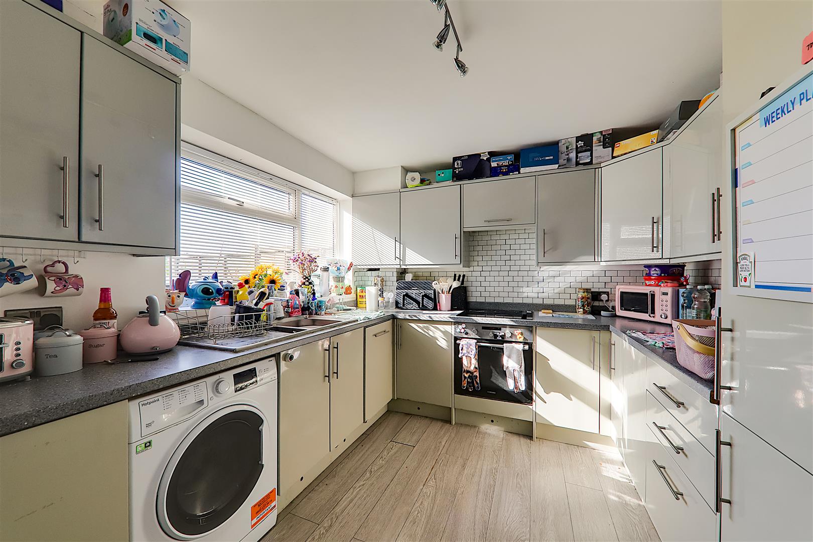 Range of work surfaces with cupboards and drawers fitted under. Space for washing machine. Integrated slimline dishwasher. Inset one and a half bowl sink unit. Wall mounted cupboards. Fitted electric hob with oven under. Integrated fridge/freezer. Double glazed window. Wall mounted boiler concealed in cupboard. Double glazed door. opening to the rear communal courtyard. Breakfast bar. Radiator. Light grey wood effect laminate floor.