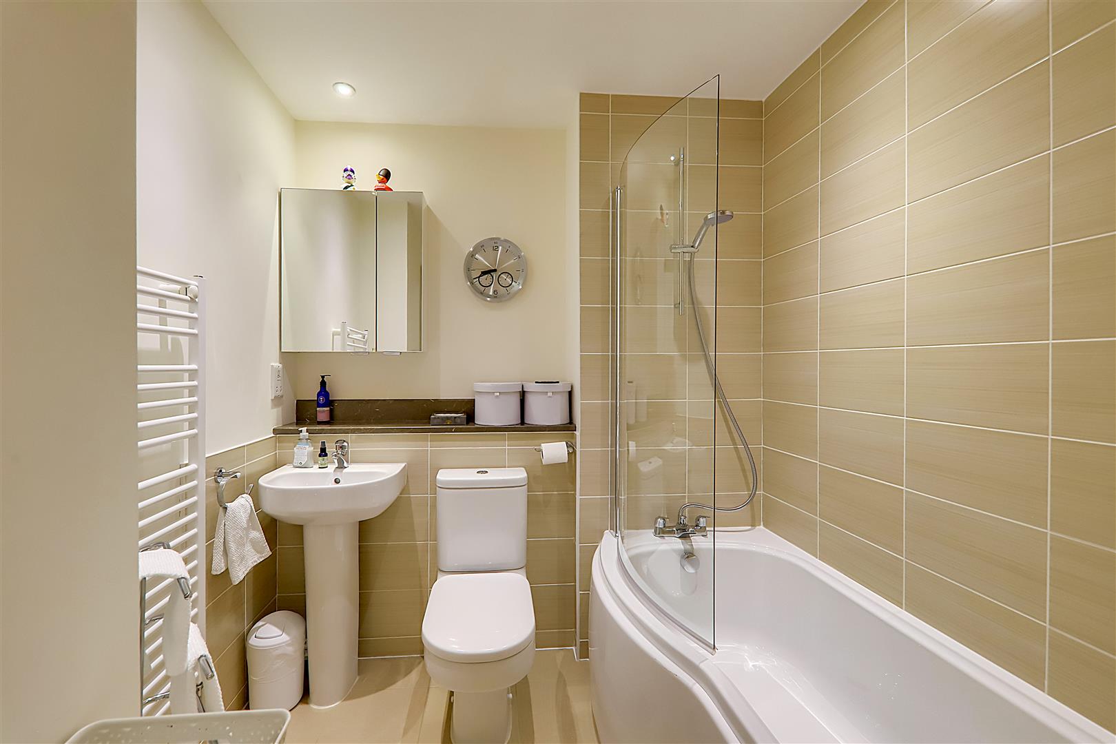 Stone flooring. Full length P shape shower bath. Glass screen. Pedestal wash hand basin with mixer tap. Toilet. Mirrored vanity cabinet with shelf below. Part tiled walls. Heated towel rail. Levelled ceiling with inset spotlights.