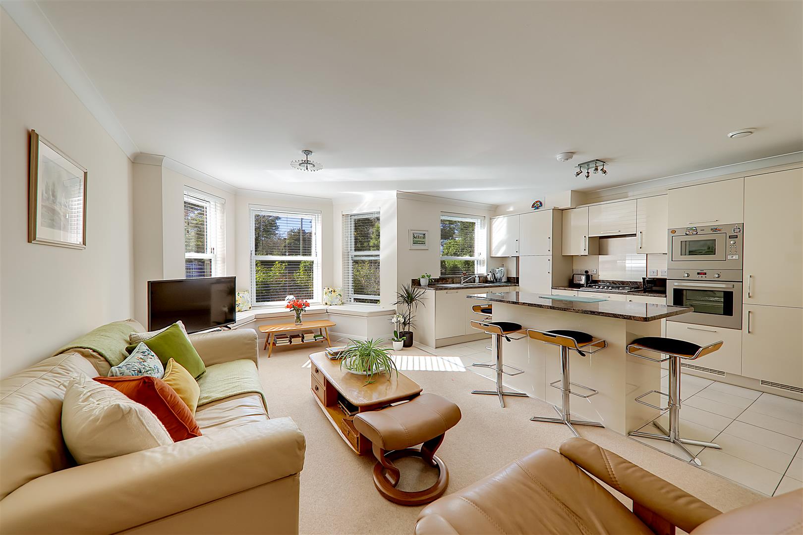 Westerly aspect double glazed bay window, cleverly designed with window seat providing storage below. Telephone and TV point. Modern sash window. Levelled ceiling with multiple pendant lights. Two storage cupboards have been installed to provide additional storage. Carpet.