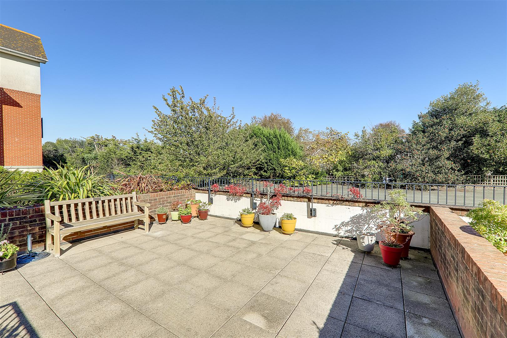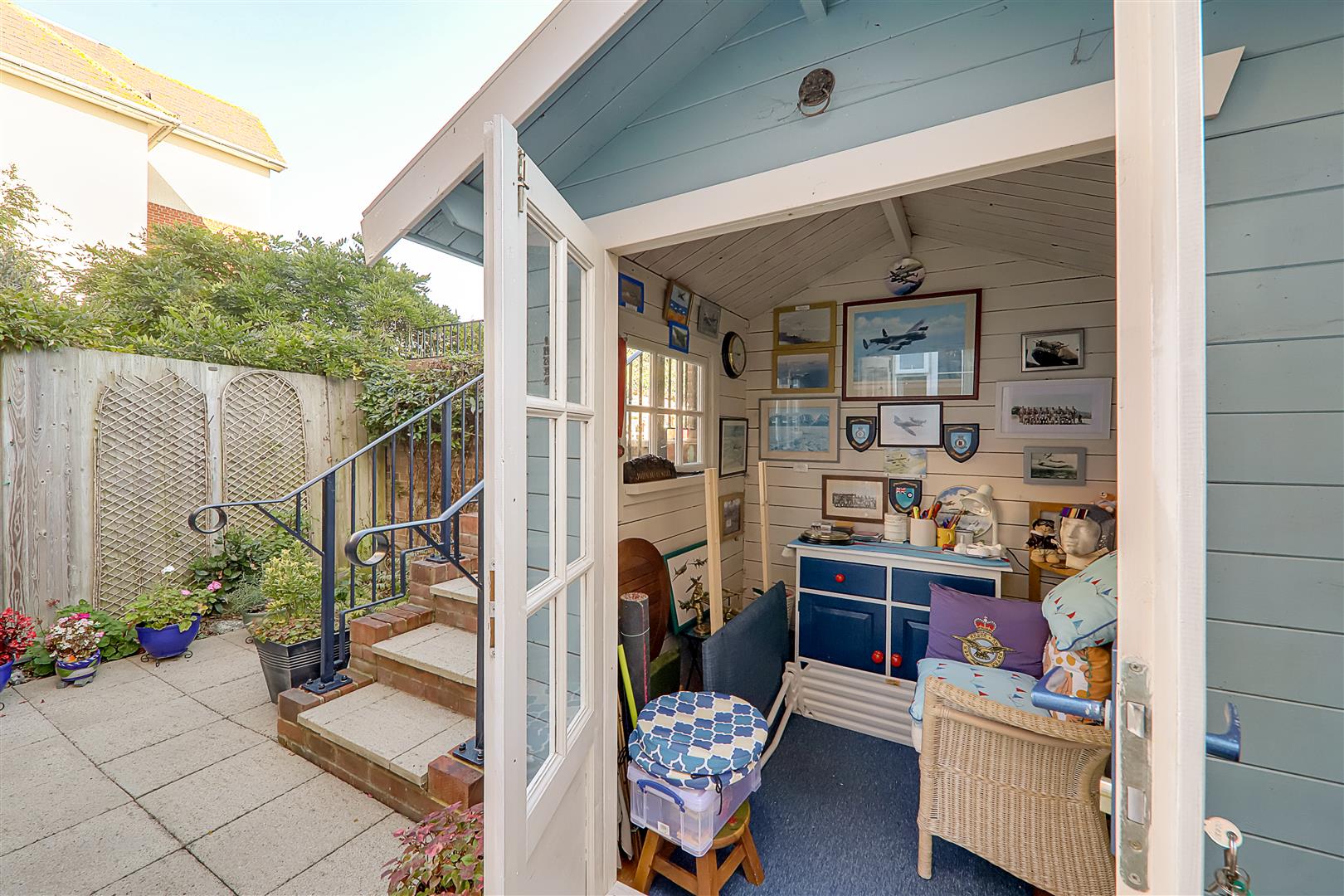 Low maintenance rear garden. Paved patio with flower boarders. Retractable awning. Summer house. Steps leading to a raised patio area, wall and rail enclosed. Outside light.