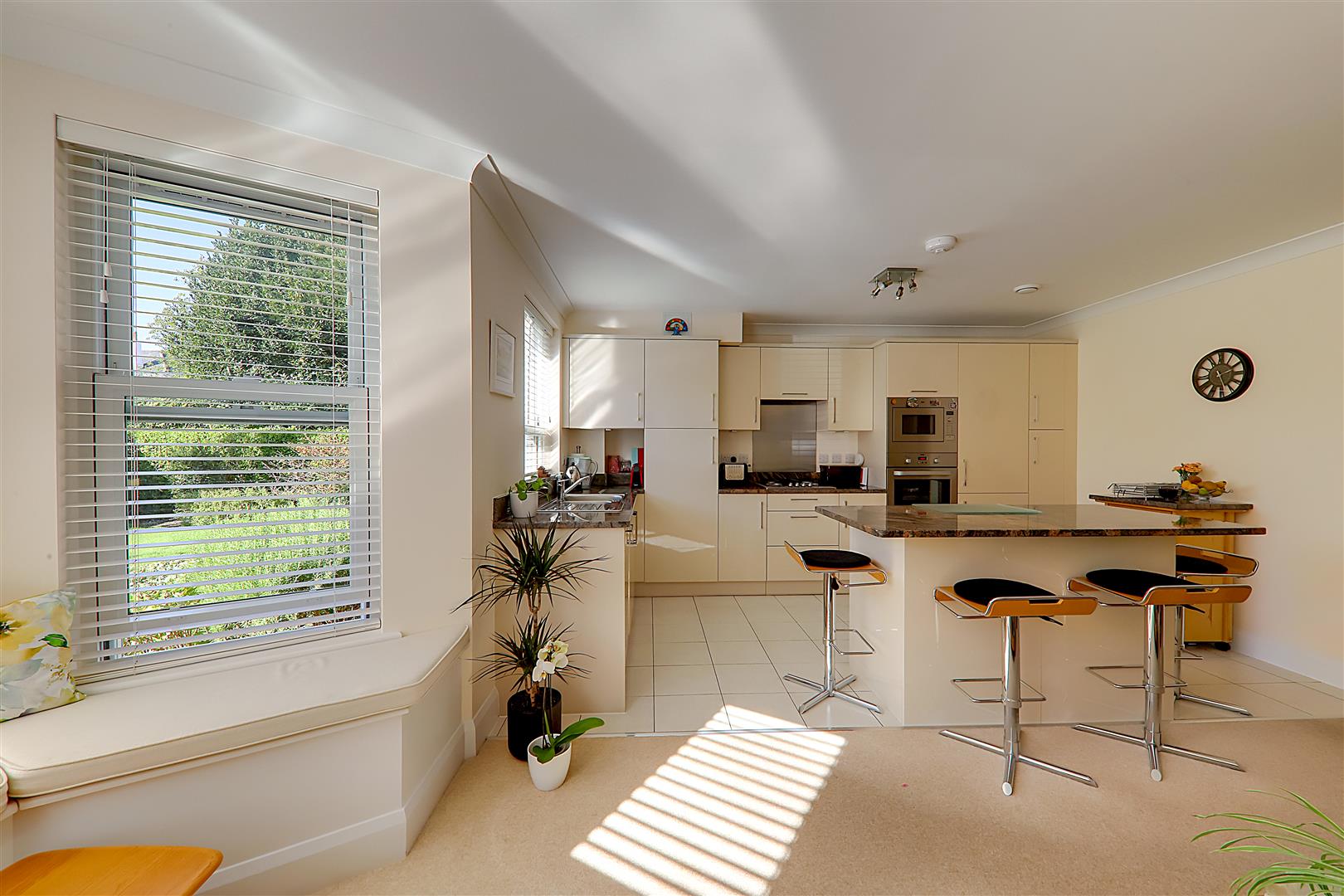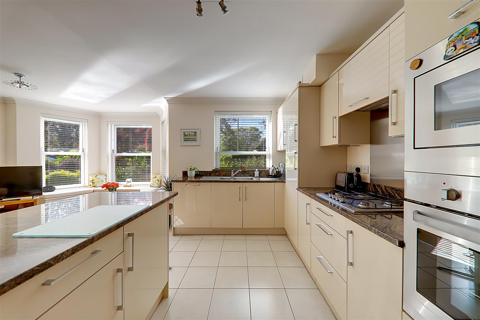 Black marble granite work surfaces with a range of high gloss base and wall units. One and a half bowl stainless steel sink with mixer tap. Integrated Fridge/Freezer. 'Zanussi' eye level oven and separate microwave above. 4 burner gas hob with extractor fan above. Refitted 'Bowman' boiler. Full sized dishwasher. Kitchen island providing additional base unit storage and black marble granite worktop space. Modern opening double glazed sash window. Tiled Floor. Air circulation system.