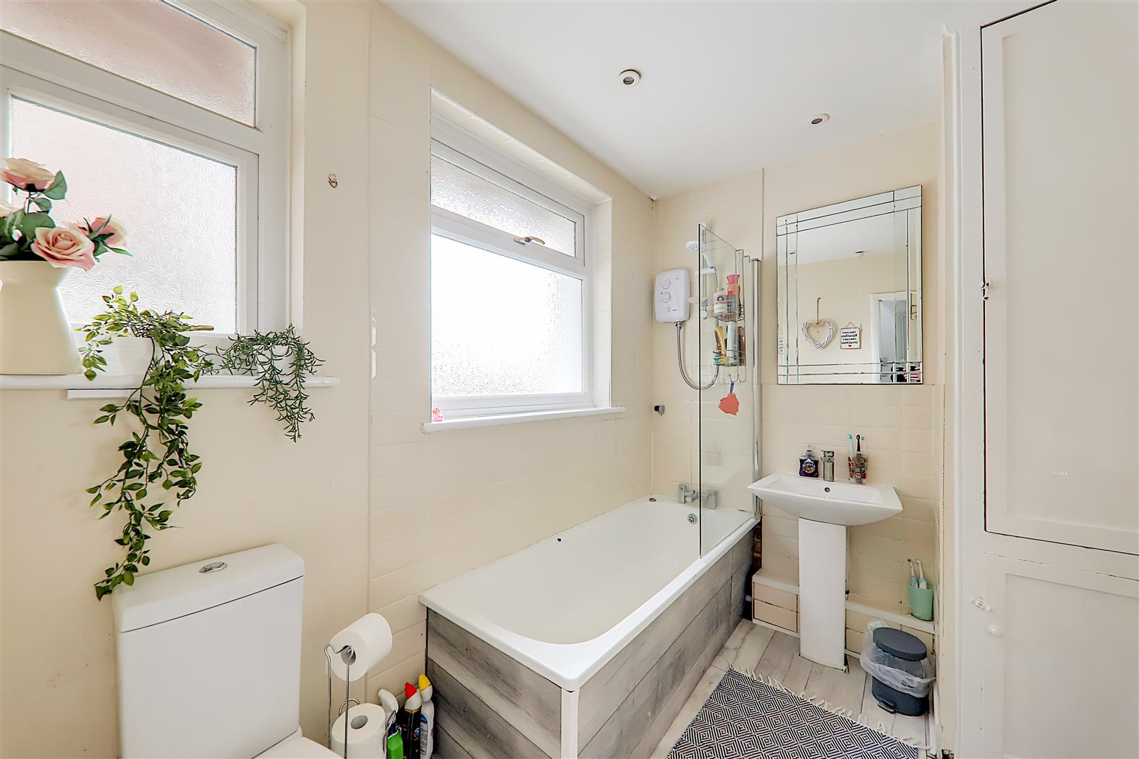 White suite comprising panelled bath with glazed shower screen, mixer tap and electric triton shower. Pedestal wash hand basin with mixer tap. Close coupled WC. Towel radiator. Shelved linen cupboard. Inset ceiling spotlighting. Two double glazed windows.