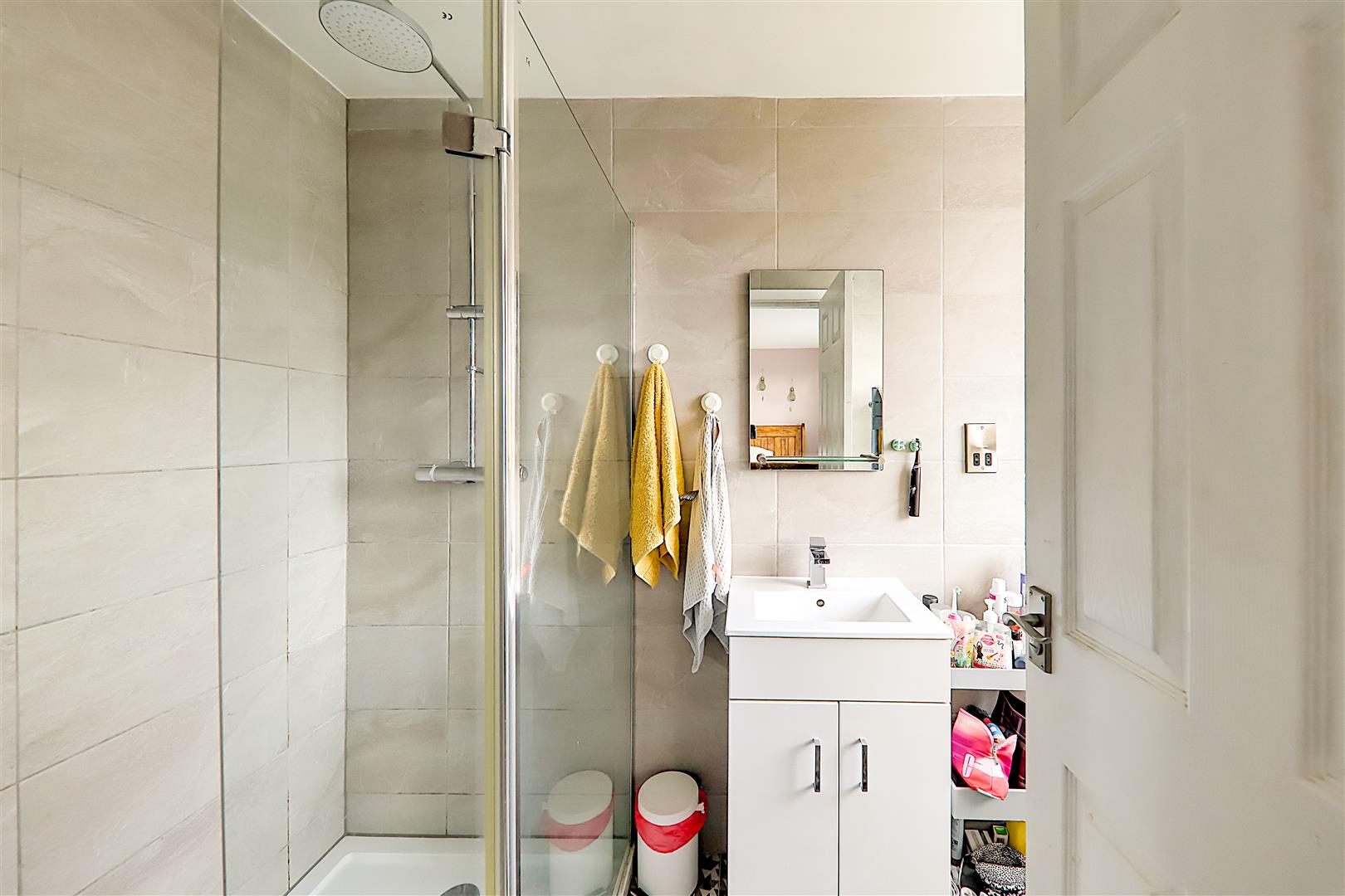 Walk in shower tray with glazed screen, wall mounted controls, and overhead rainfall shower. Vanity unit having wash hand basin and mixer tap with cupboard below. Close coupled WC. Double glazed window. Extractor fan. Ladder style towel radiator. Shaving socket.
