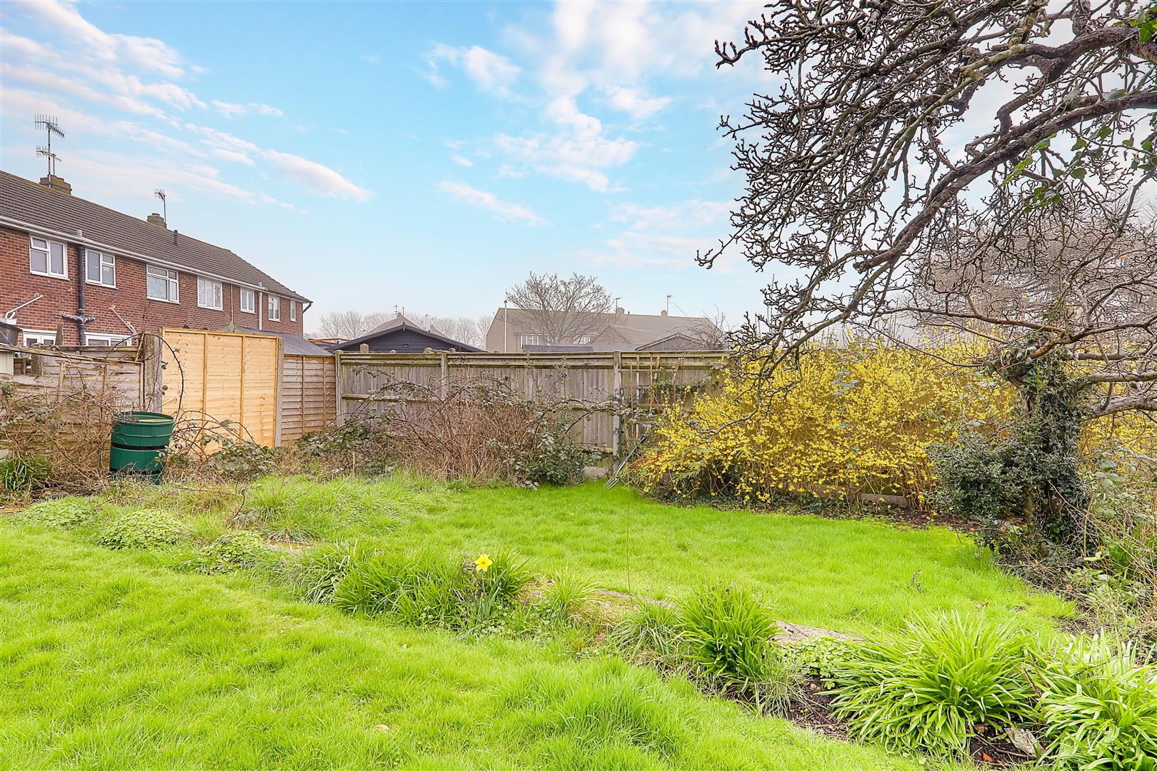 Laid to shrubs, flower borders, possiblity to erect fencing to enclose privately.