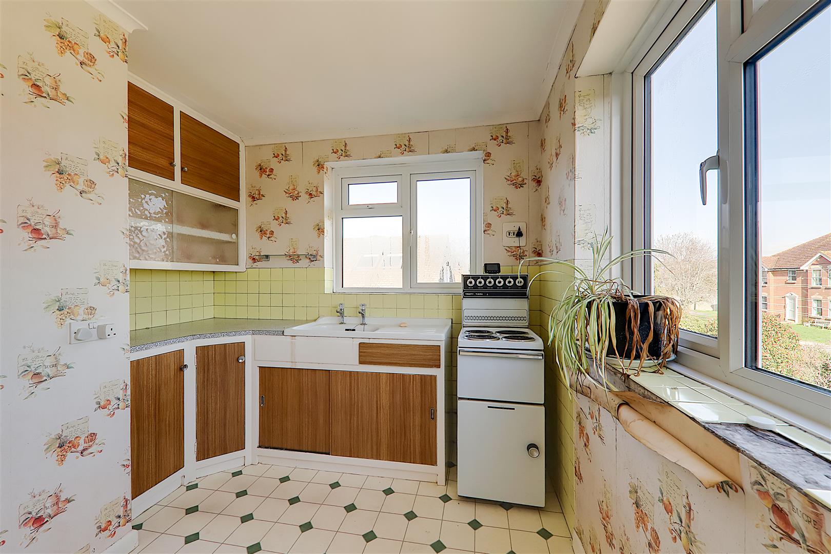 Vinyl flooring, square edge work surfaces with cupboards below & matching eye level cupboards, inset porcelain sink unit with single drainer & mixer tap, space for oven, two PVCU double glazed windows.