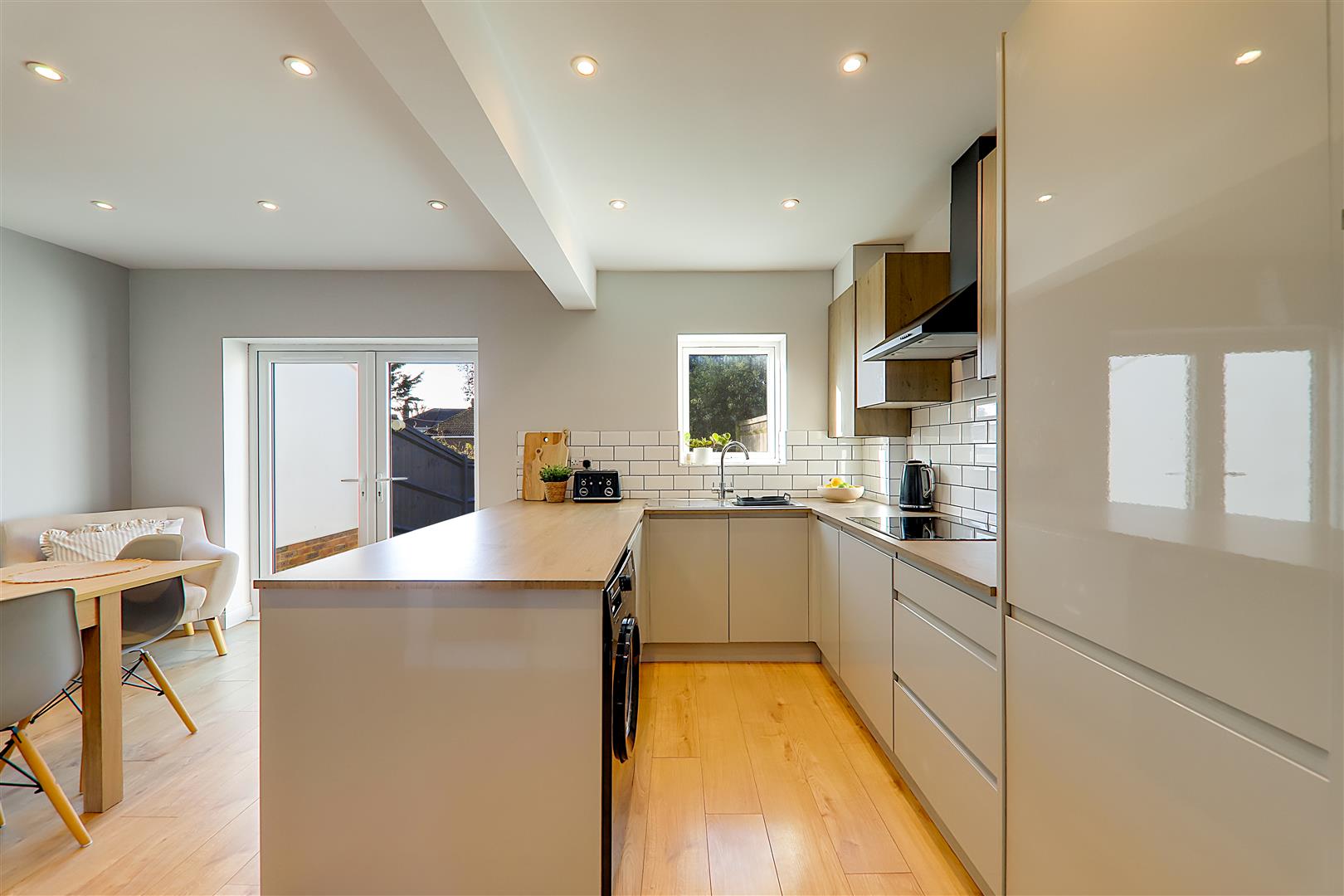 Part tiled in attractive ceramics. Refitted with excellent range of units comprising work surfaces with inset single drainer sink unit with mixer taps. Base units of cupboards and drawers and incorporating peninsula area. Matching eye level wall units. Integrated dishwasher. Integrated fridge/freezer. Fitted oven. Four ring induction hob with extractor cooker hood over. Space and plumbing for washing machine. Double glazed window. recessed ceiling spot lighting. Double glazed french doors leading from dining area to garden.