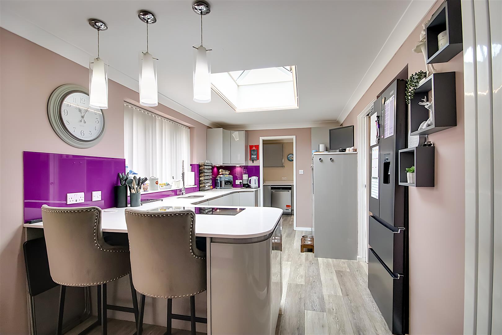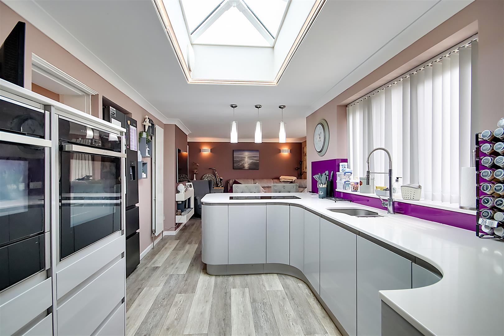Kitchen Area: LVT flooring, silestone worksurfaces with cupboards below & matching eye level cupboards with a high gloss finish, integrated Neff eye level double oven one of which benefits from being multi purpose & can be used as a microwave & having a heating drawer, inset stainless steel single drainer sink unit with mixer tap, integrated four ring induction hob, PVCU double glazed window, extractor fan, feature sky lantern, space for fridge freezer, television point, various power points, pocket door through to Utility Room, breakfast bar area with seating for two.