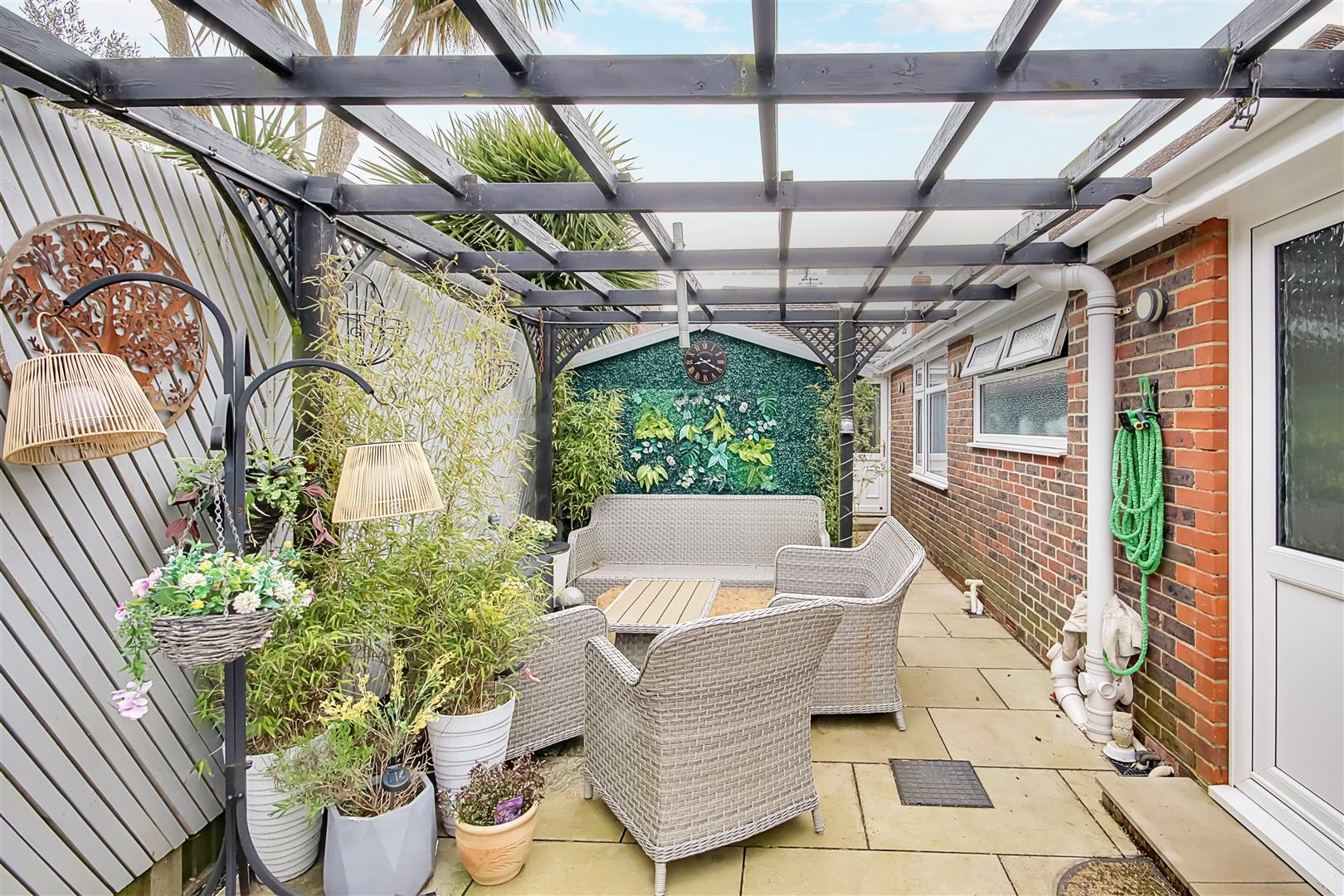 Large wrap around patio area, stepping down onto artificial lawned area having various raised flower borders, gated side access, outside power sockets, outside hot & cold tap, timber built summer house having it's own fuseboard, power, lighting & television point, pergola area with seating area below, timber built storage shed also having it's own power & lighting having a separate fridge & freezer units & various recessed shelving spaces.