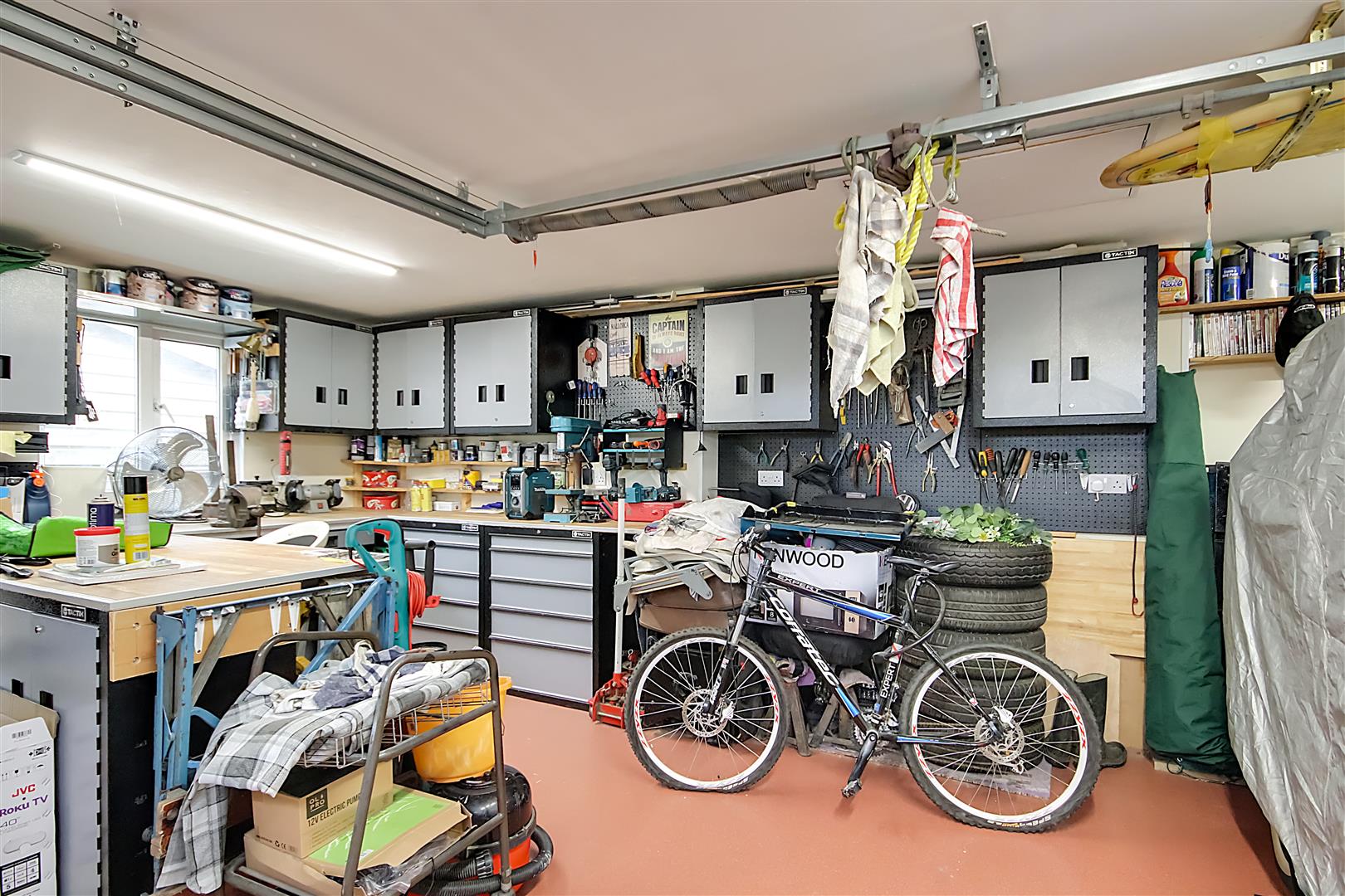 Workshop Area: Having various workbenches & recessed shelving spaces, power & lighting.
