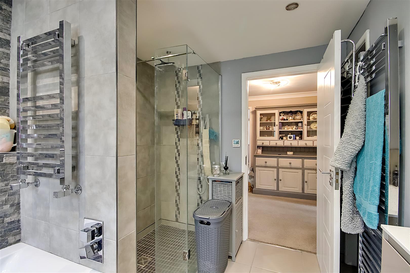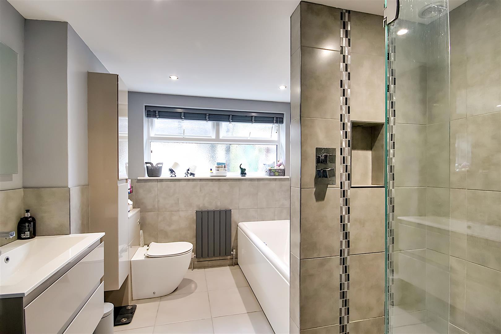 Tiled flooring, underfloor heating, single radiator, two chrome ladder style heated towel rails, walk in double width shower cubicle having an integrated power shower with rainforest fall shower head & having recessed shelving being fully tiled, wall mounted thermostatic controls, extractor fan, panel enclosed bath with feature tiled wall having recessed shelving units, low flush WC, contemporary hand wash basin with vanity unit below, wall mounted de-misting mirror, airing cupboard housing Worcester boiler & hot water cylinder, PVCU double glazed obscured glass window, skimmed ceiling with spotlights.