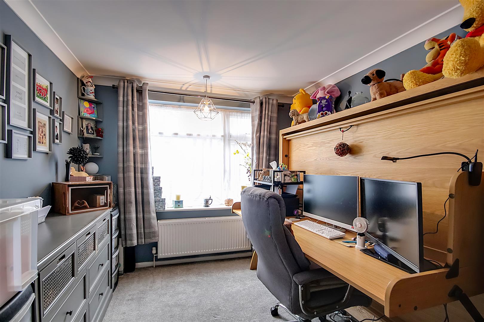 Carpeted flooring, various power points, two up-standing radiators, loft hatch access, skimmed ceiling with coving, wall mounted heating control panel.