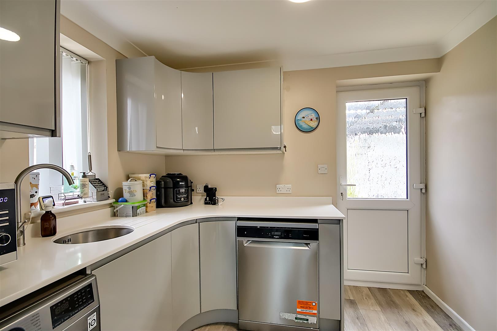 LVT flooring, silestone work surfaces with cupboards below & matching eye level cupboards with a high gloss finish, space & provision for washing machine & dishwasher, inset stainless steel single drainer sink unit with mixer tap, PVCU double glazed window, various power points, up-standing radiator, PVCU double glazed door leading to side of property, skimmed ceiling with coving, door through to Separate WC.