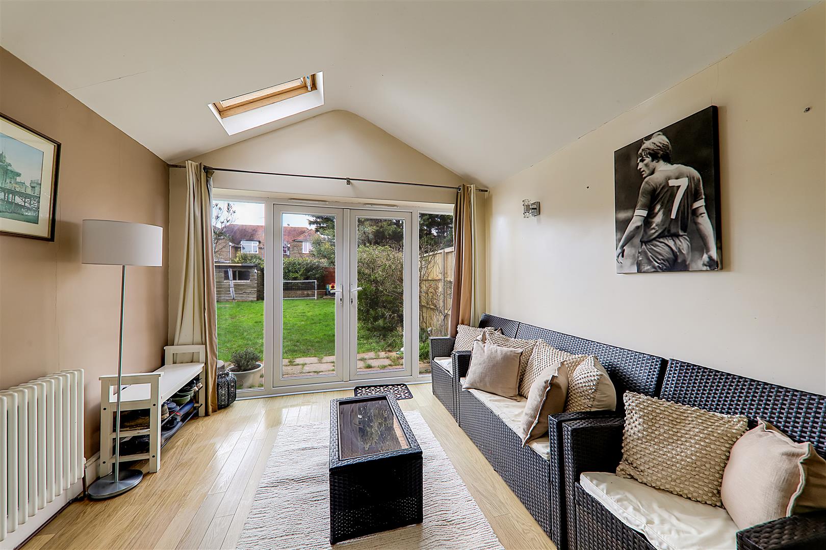 Laminate flooring, single radiator, various power points, vaulted skimmed ceiling with two Velux windows, PVCU double glazed doors leading out onto rear garden.
