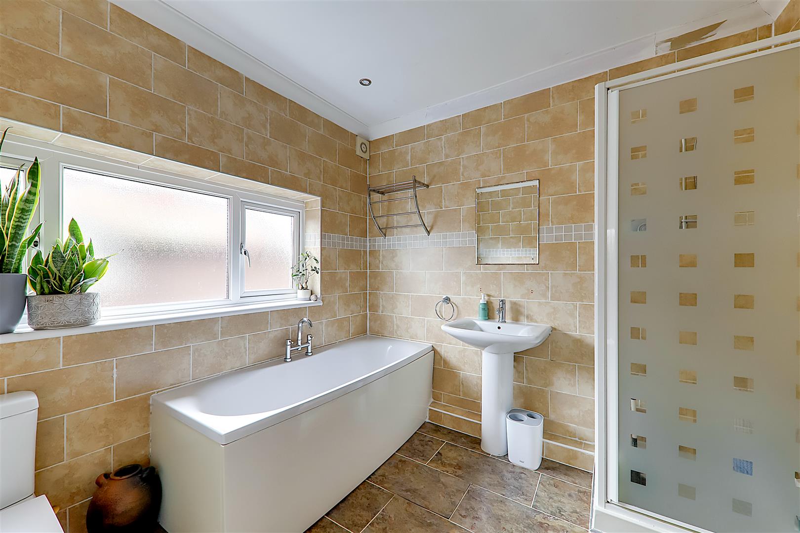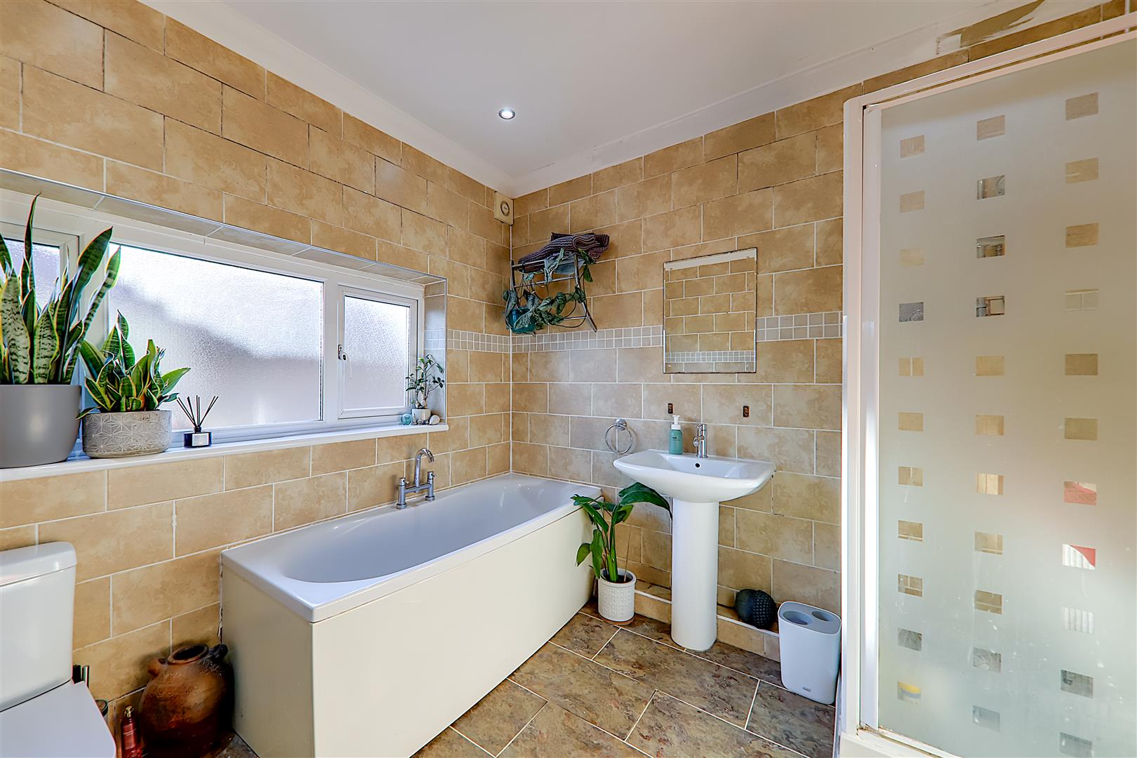Tiled flooring, fully tiled walls, low flush WC, contemporary hand wash basin with mixer tap, fitted power shower having four wall mounted adjustable jets, upstanding radiator, PVCU double glazed obscured glass window, skimmed ceiling with spotlights, extractor fan.