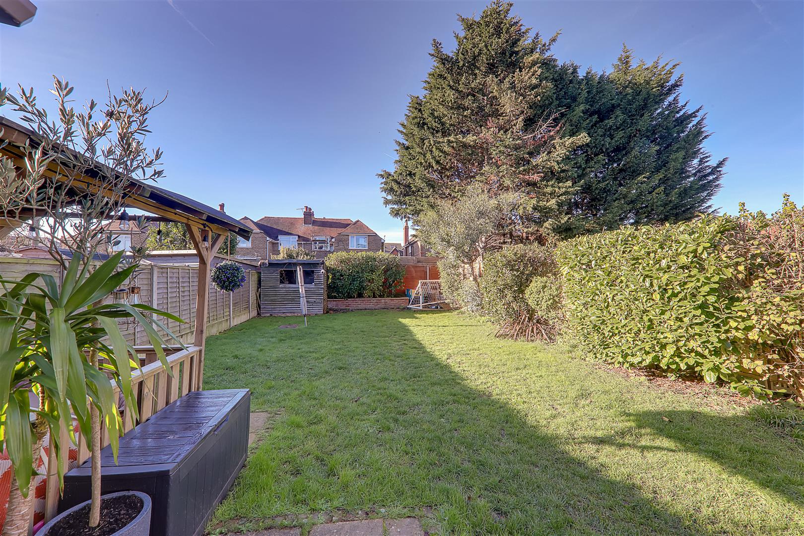 Patio area stepping on large lawned area having various mature shrub, tree & plant borders, timber built storage shed, raised flower bed to rear of garden, pergola area with space for hot tub, fence enclosed.