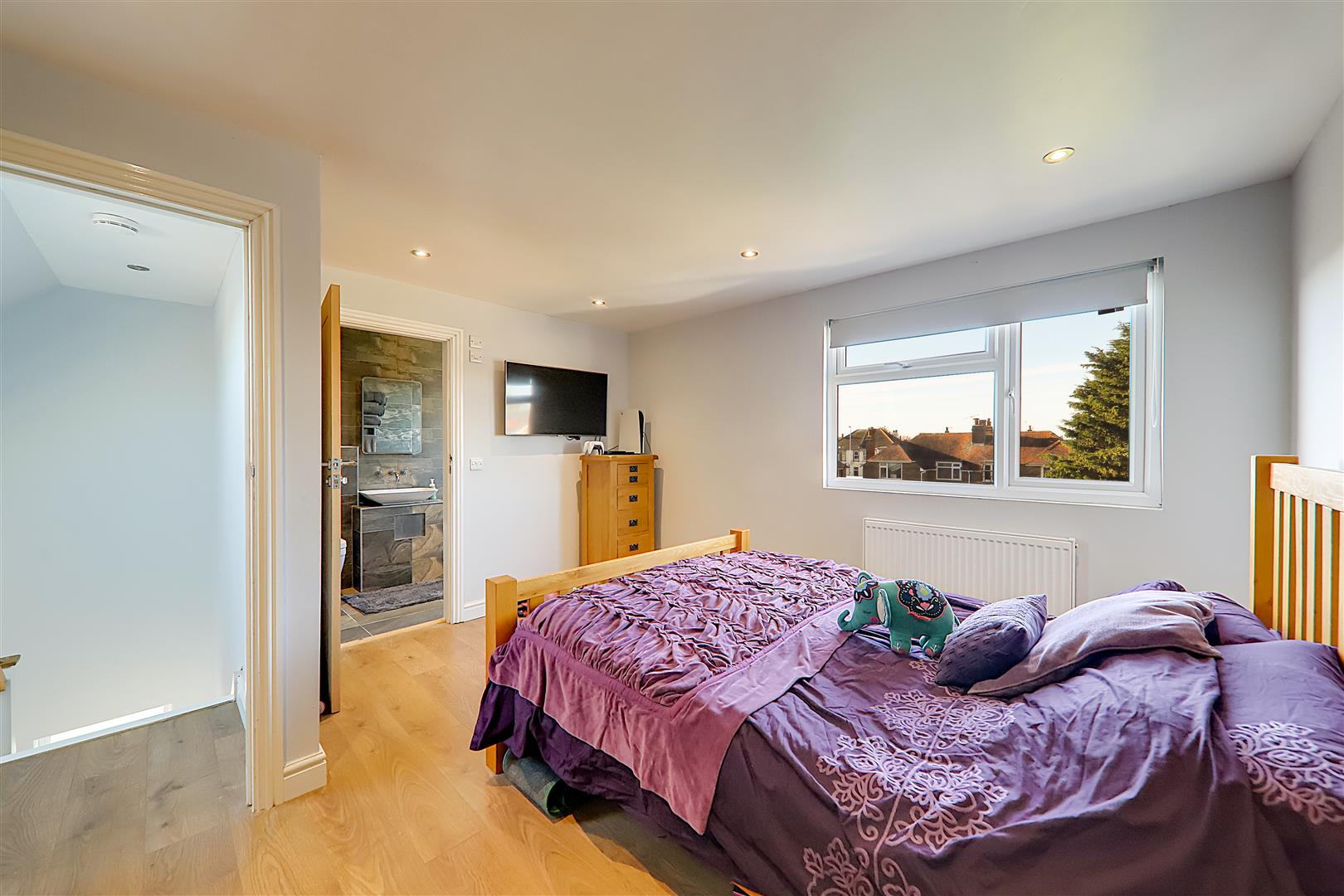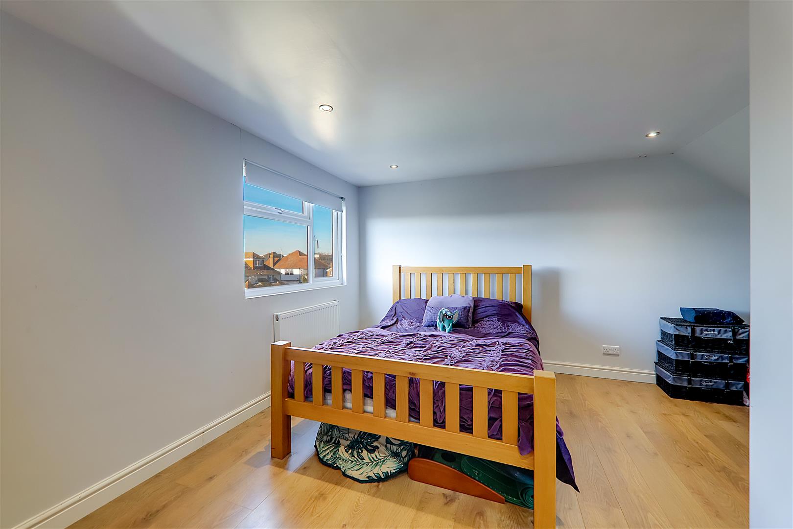 Laminate flooring, single radiator, various power points, television point, access into eaves storage space, skimmed ceiling with spotlights, PVCU double glazed window.