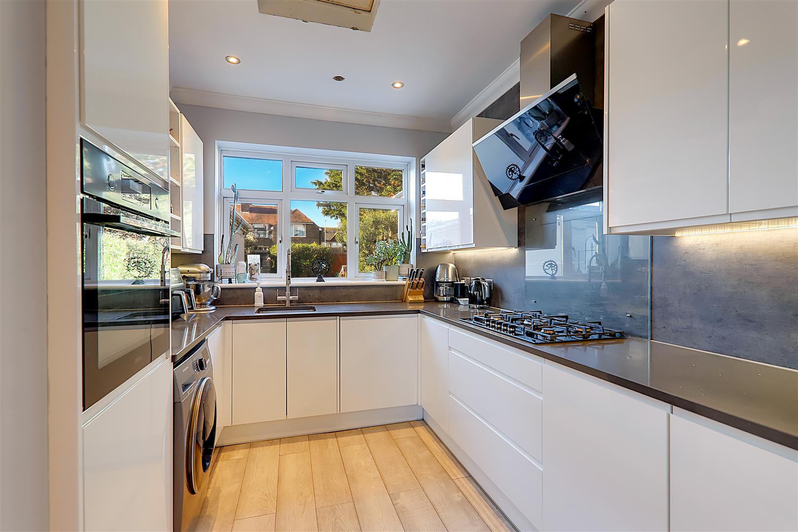 Dual aspect, laminate flooring, single radiator, two PVCU double glazed windows, square edge granite work surfaces with cupboards below & matching eye level cupboards with a high white gloss finish, integrated eye level oven, inset five ring AEG gas hob with AEG extractor fan above, inset stainless steel single drainer sink unit with mixer tap, matching integrated dishwasher, space for American style fridge freezer, space for washing machine, integrated bin store, skimmed ceiling with spotlights & coving.