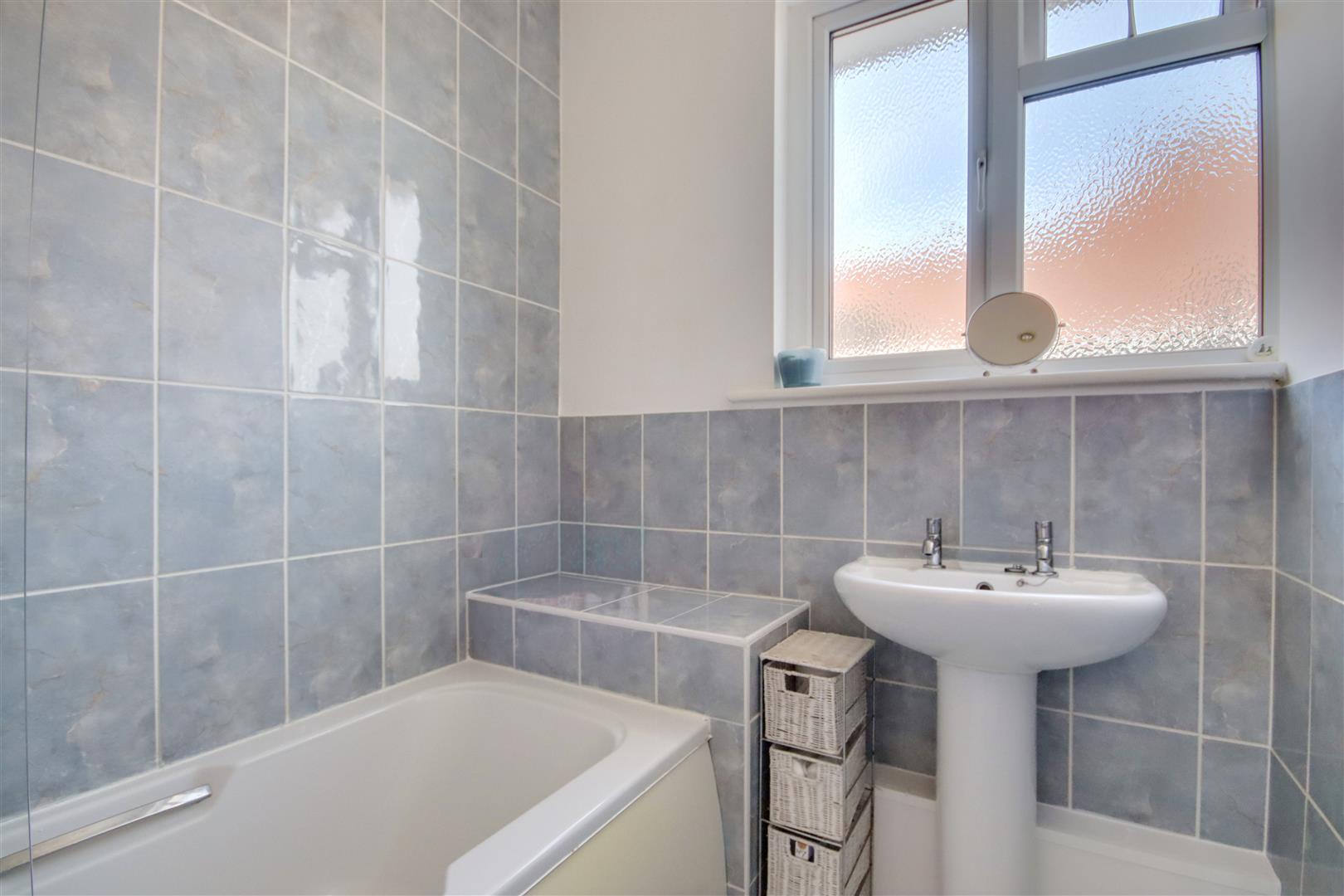 White suite comprising panelled bath with mixer tap and glazed shower screen. Wall mounted controls feeding overhead shower. Pedestal wash hand basin. Double glazed window. Inset ceiling spotlights. Parts tiled walls. Tiled floor. Ladder style towel radiator.