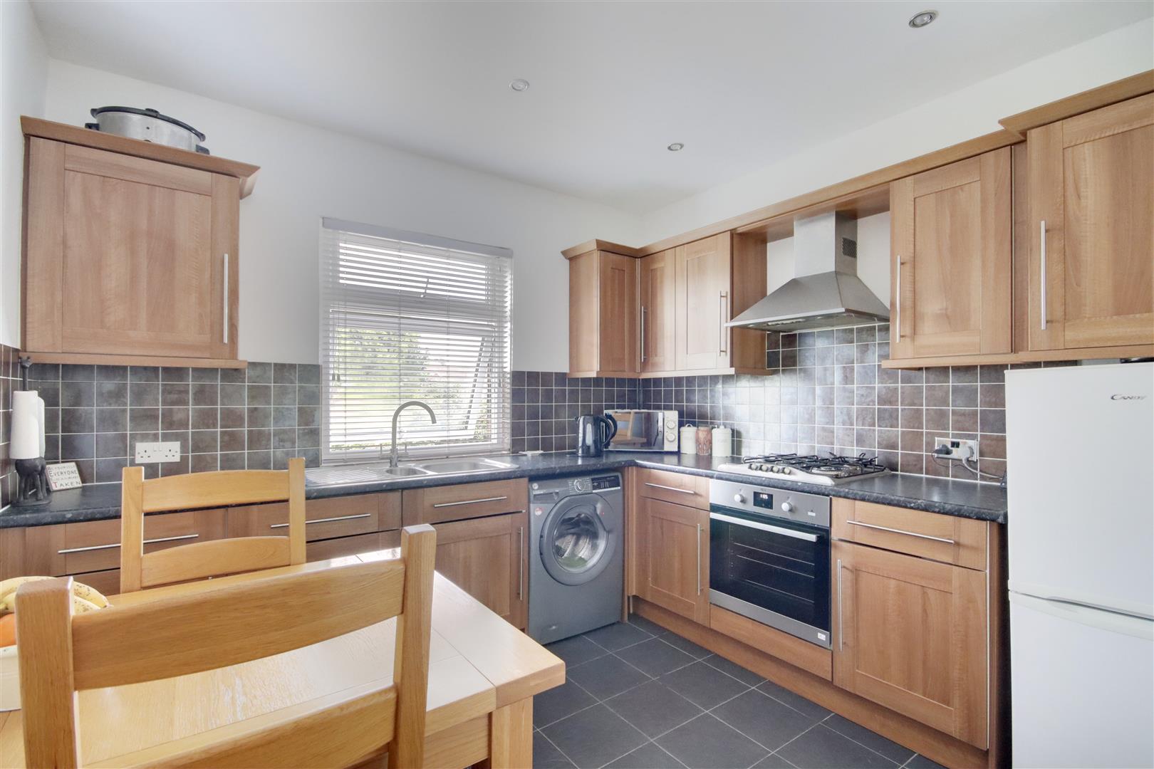 Roll edge works surface having insect one and a half bowl stainless steel sink with mixer tap and draining board. Four ring gas hob with extractor cooker hood over. Fitted ‘AEG’ fan oven. Space and plumbing for washing machine. Space for fridge/freezer. Excellent range of matching cupboards, drawers and eyelevel wall units. Double glazed window. Radiator. Inset ceiling spotlights. Recessed shelved cupboard housing ‘Valliant’ combination boiler supplying gas central heating and hot water.