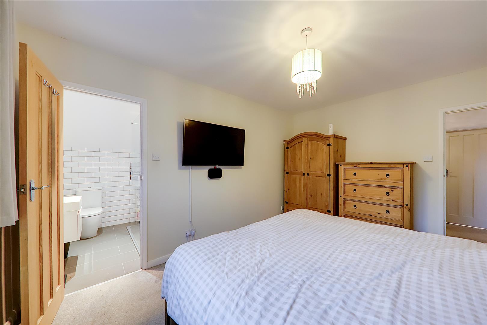 Walk in shower tray with glazed fixed shower screen, wall mounted controls and overhead shower. Close coupled WC. Wall mounted vanity unit with wash hand basin, mixer tap and drawers below. Ladder style towel radiator. Fully tiled walls. Double glazed window. Inset ceiling spotlighting. Extractor fan.