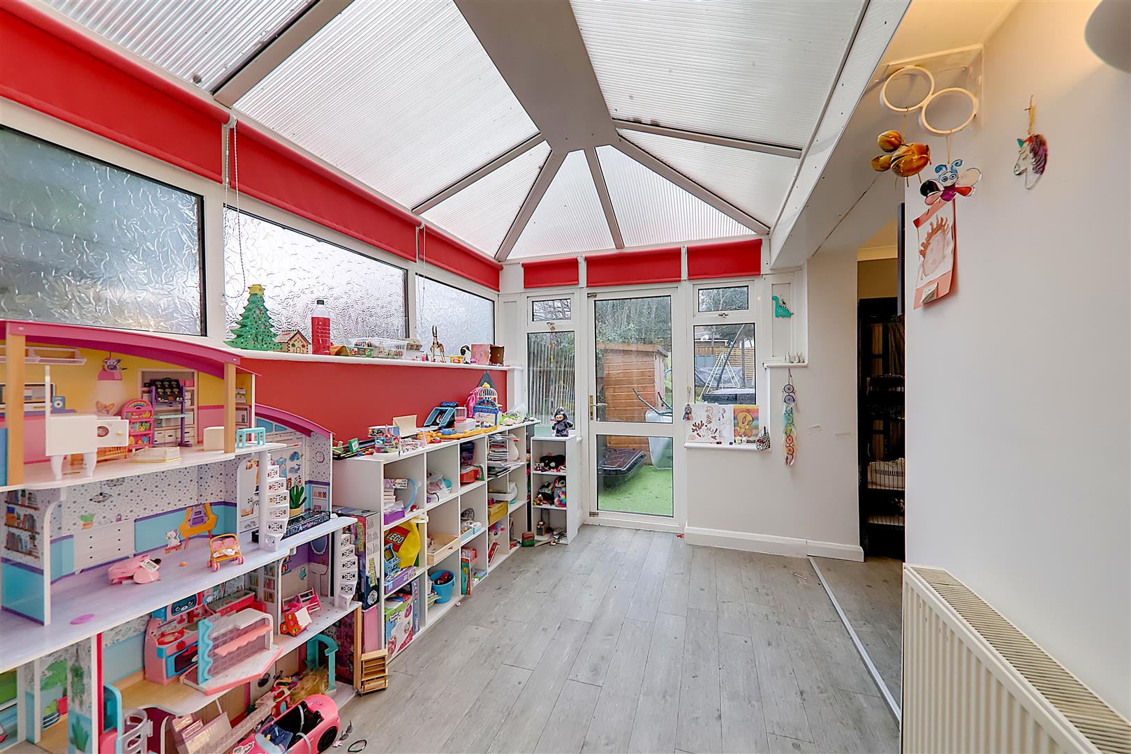Perspex pitched roof. Double glazed window side. Double glaze door to rear garden opening too: