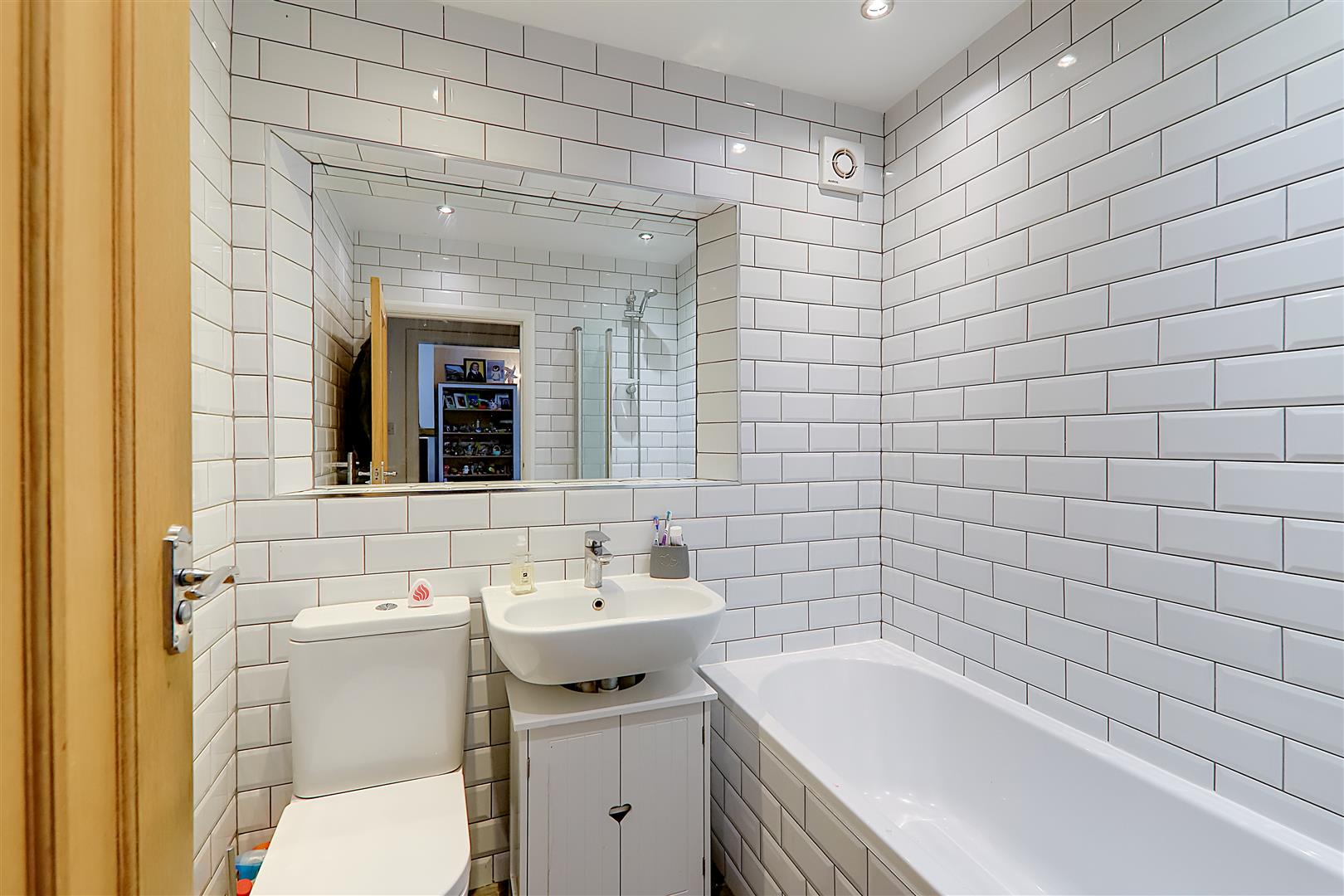 White suite comprising panelled bath with retractable shower screen, mixer tap and shower attachment. Pedestal wash hand basin with mixer tap. Close coupled WC. Fully tiled walls. Inset ceiling spotlighting.