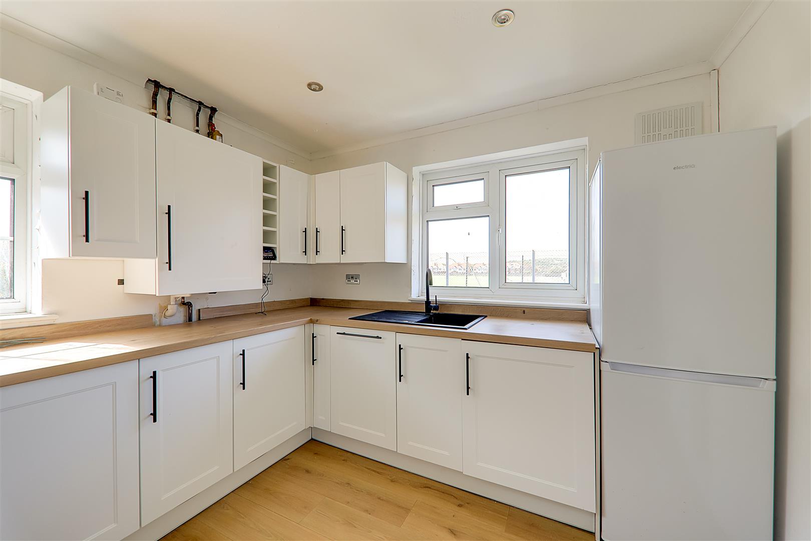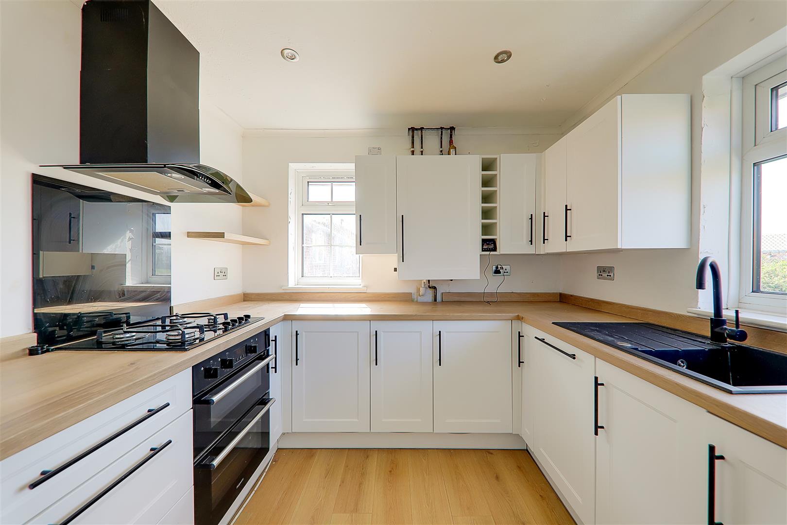 Modern fitted kitchen comprising: Roll top work surfaces with sink unit with mixer taps. Matching range of base and eye level wall units. Double aspect with double glazed windows. 2019 wall mounted 'Ideal' gas fired combination boiler. Radiator.