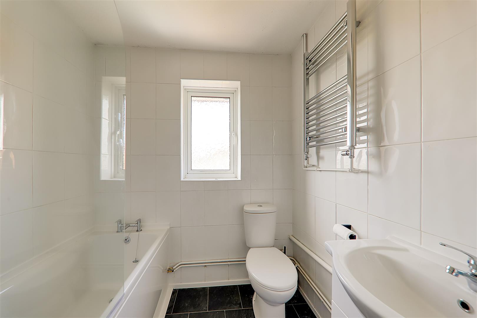 Modern white bathroom suite comprising of panelled bath with mixer taps and 'Triton' shower unit above. Pedestal wash hand basin. Close coupled wc. Double glazed window.